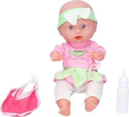 Adorable bebé con cochecito, ideal para el juego infantil y para explorar el mundo de la fantasía. El paquete incluye un cochecito plegable, un babero y un biberón para una experiencia de juego completa.
