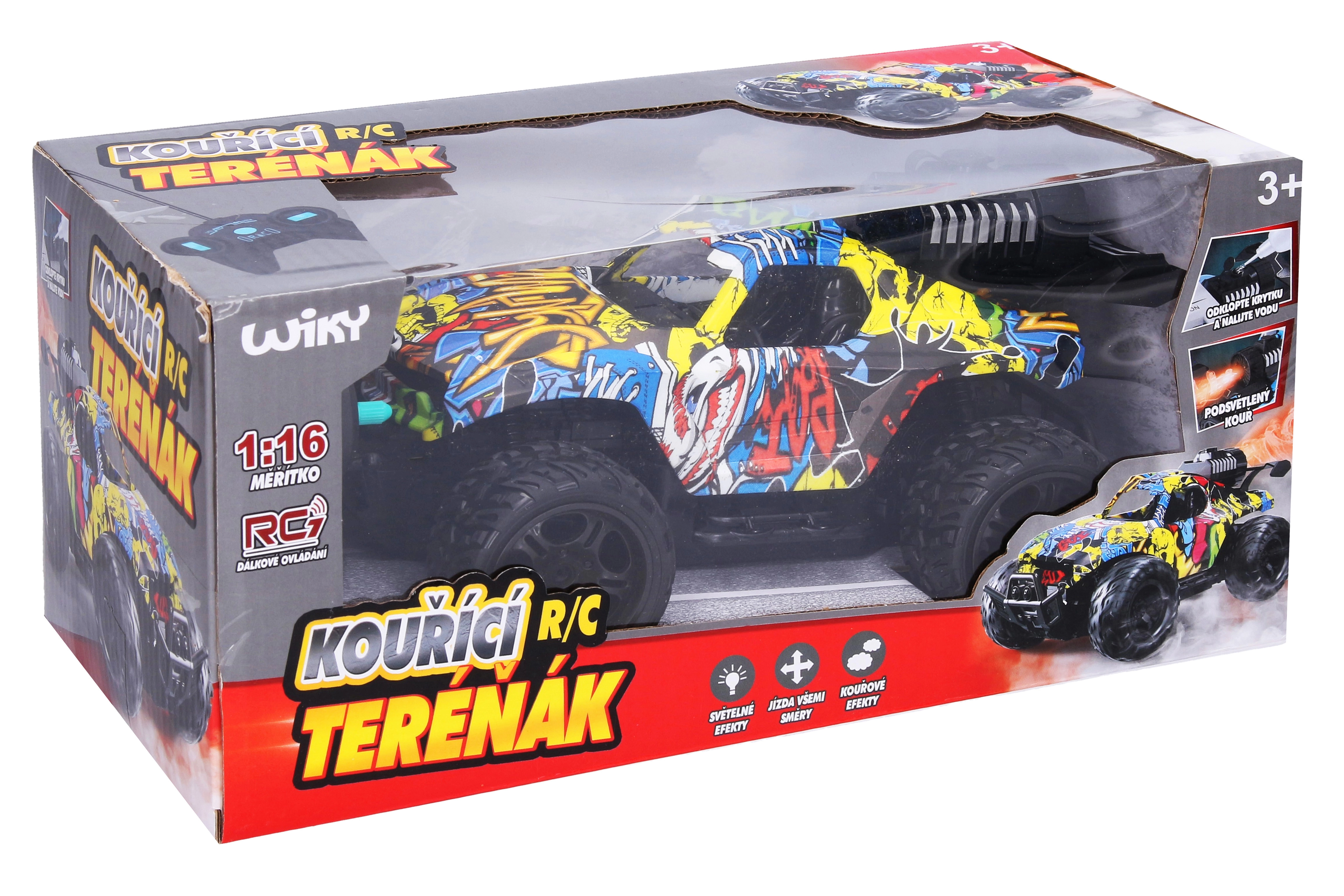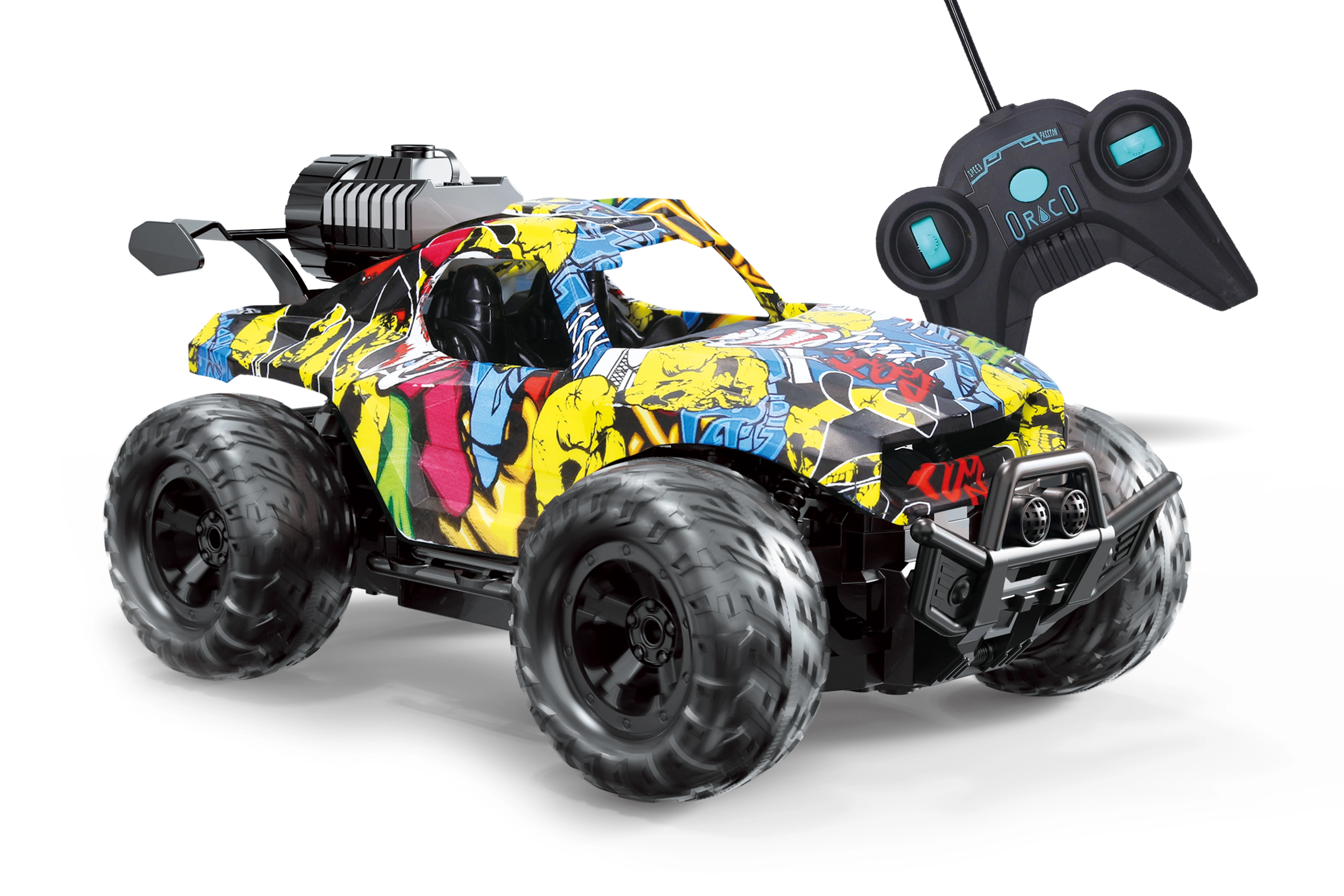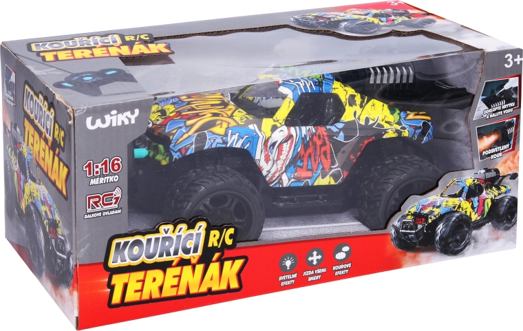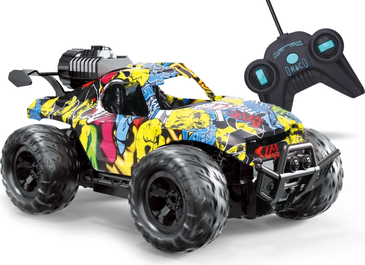 Este coche RC todoterreno con un estilo graffiti muy cool aporta mucha diversión gracias a la combinación de efectos de luz y efecto de humo. El humo se activa con un botón en el mando y resulta muy realista gracias al fácil rellenado de agua en el depósito. Con unas dimensiones de 24 × 14,5 × 10,6 cm, se maneja de maravilla y es apto para principiantes y pequeños corredores.