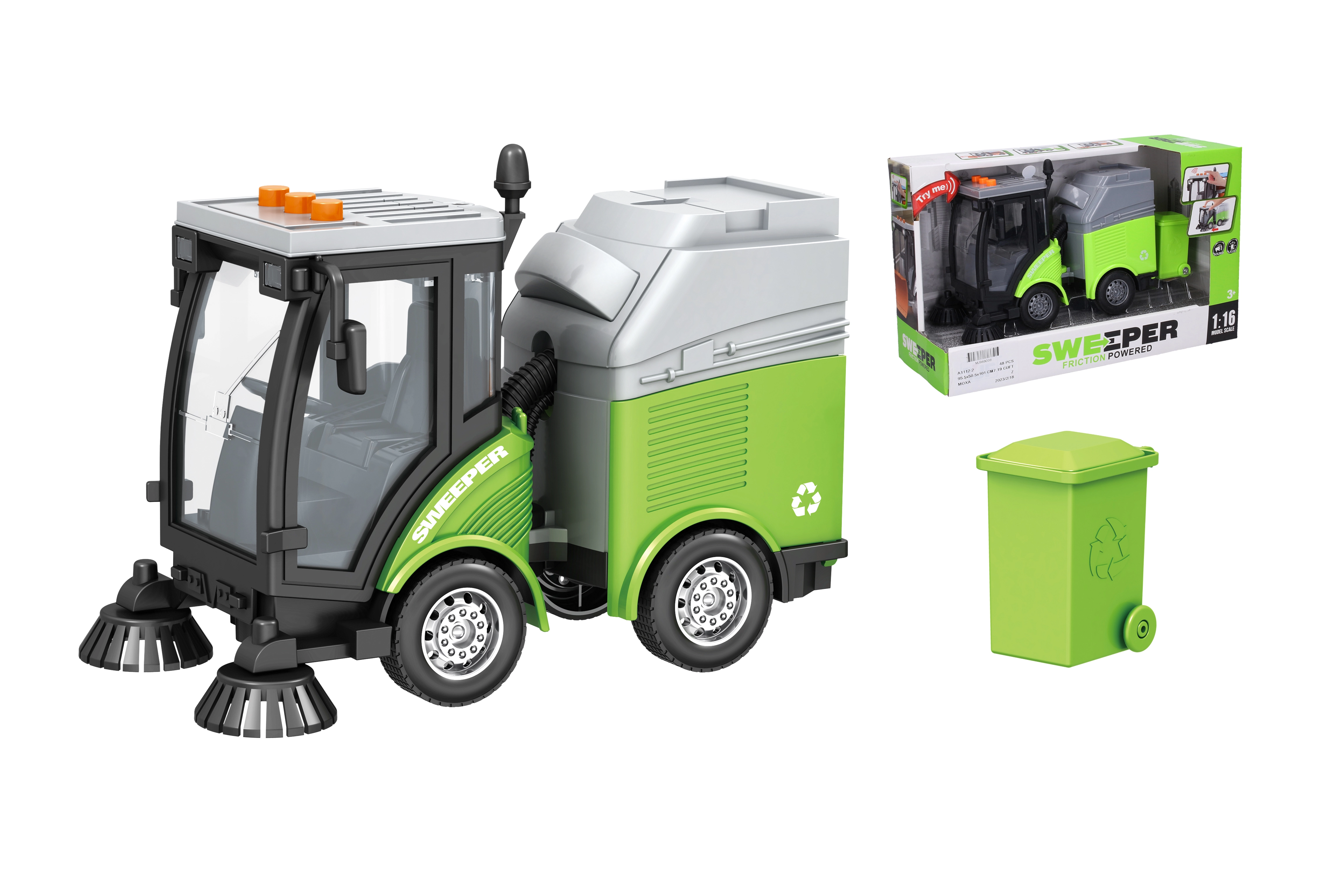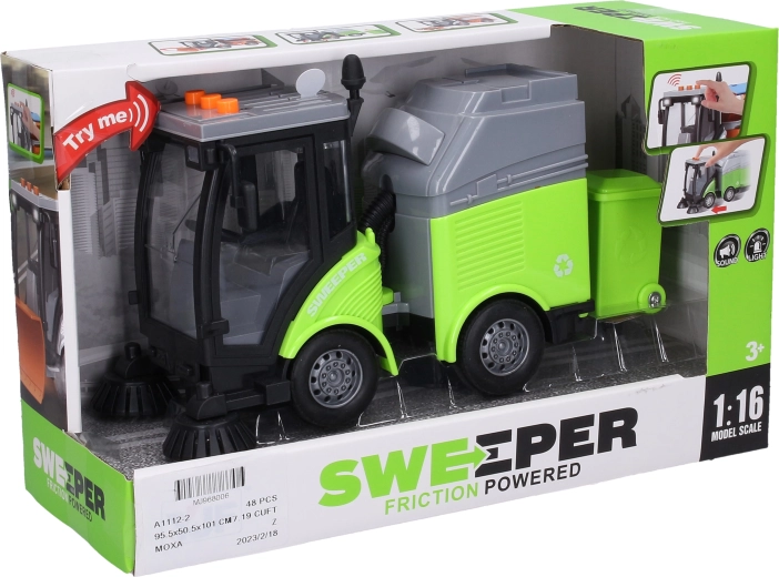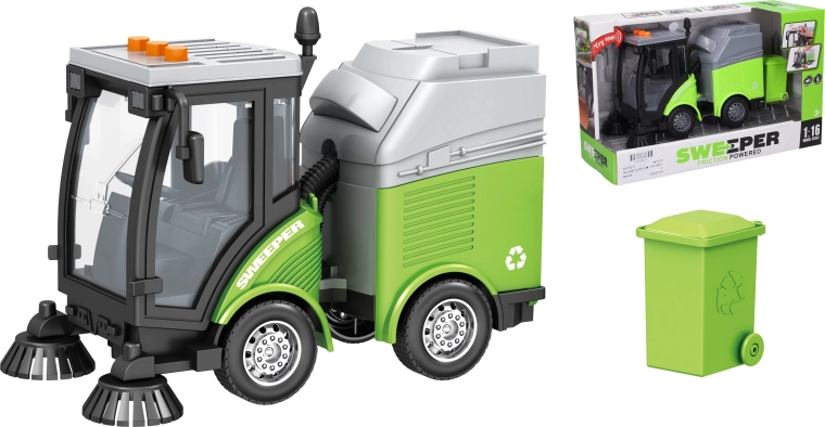 Divertido y realista camión de limpieza con contenedor de 24 cm para todos los pequeños entusiastas de la tecnología. Gracias al mecanismo de inercia, la conducción es fluida y sencilla, y la atmósfera la crean los efectos de luz y sonido activados por los botones de la cabina: arranque, claxon y marcha atrás. Las pilas 3× AG13 están incluidas en el paquete, así que la diversión puede comenzar de inmediato.