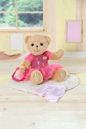 El osito lleva un atuendo blanco con estilo que puede combinarse fácilmente con otras prendas de la colección BABY Born.