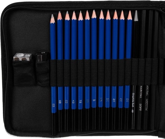 Este versátil set de dibujo de 32 piezas combina diferentes durezas de lápices (B, HB, H), carboncillos en madera y en barras y barras de grafito para lograr líneas finas, sombras profundas y transiciones tonales suaves. Todo se guarda de forma ordenada en un resistente estuche con cremallera y asa, que protege las herramientas y facilita su transporte.