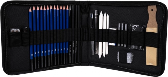 Incluye también difuminadores (tortillones de papel) en tres diámetros, cúter de encuadernador, sacapuntas doble y clásico, goma moldeable y goma clásica, y un set de papeles de lija para un afinado perfecto de la punta. Es ideal para retrato, dibujo técnico y bocetos artísticos.