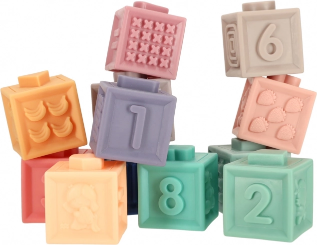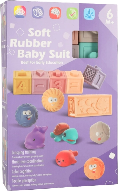 Este set sensorial combina diversión y aprendizaje en uno. Los cubos de silicona blanda con números y signos motivan a los niños a contar por primera vez, mientras que las distintas texturas y relieves desarrollan el tacto y la concentración. Las pelotas y los cubos son ideales para construir torres, clasificar y el juego libre.