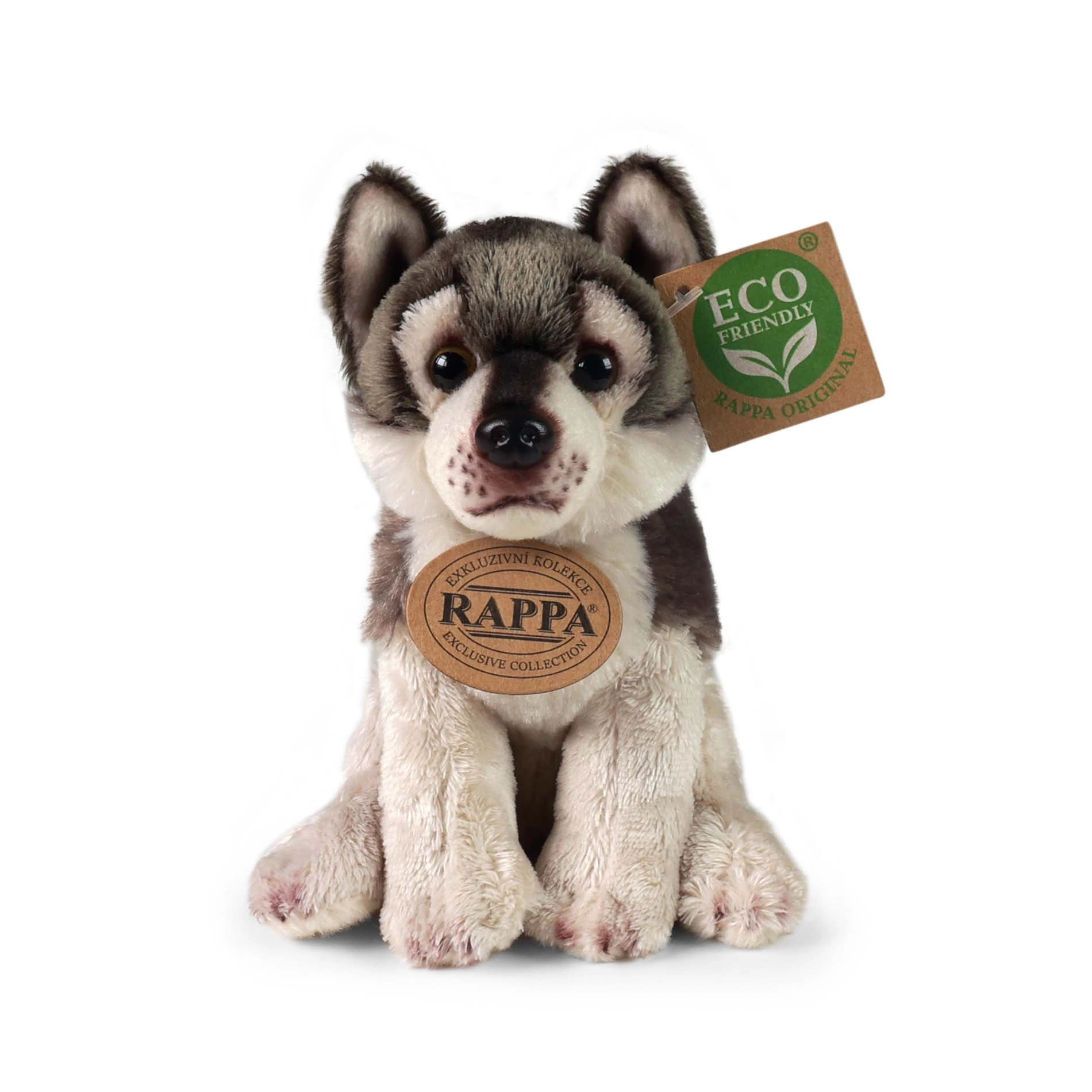 Adorable lobo de peluche de la marca Rappa en posición sentada que encantará a pequeños y grandes amantes de los animales. Está hecho de felpa de alta calidad con relleno ECO‑FRIENDLY suave de botellas PET recicladas. Ofrece detalles realistas, acabado artesanal y materiales seguros para niños desde 0+.