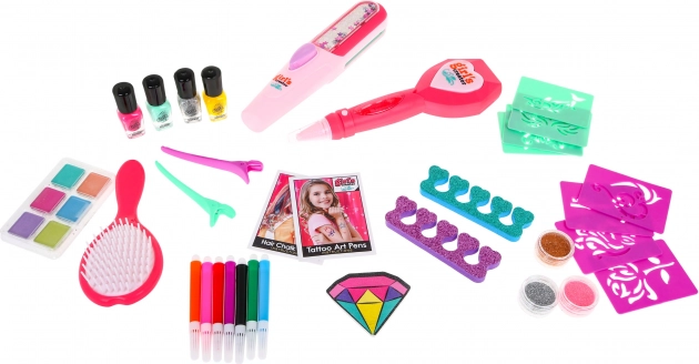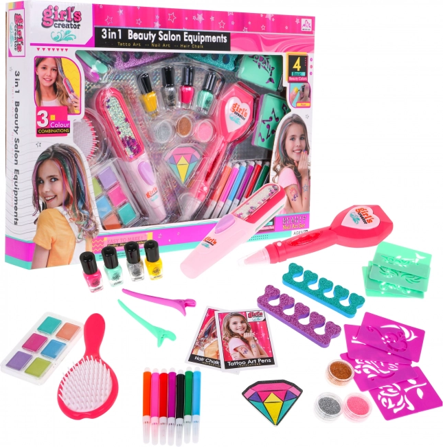 Hermoso set 3 en 1 para niñas ideal para crear peinados con colores, manicuras y tatuajes creativos. Este set combina accesorios cosméticos seguros y no tóxicos que se retiran fácilmente al terminar la diversión.