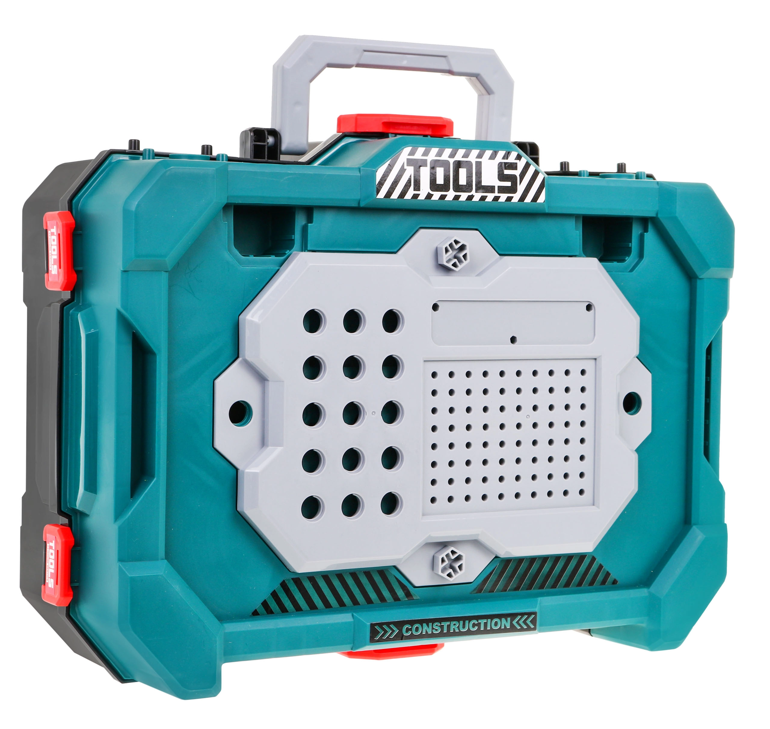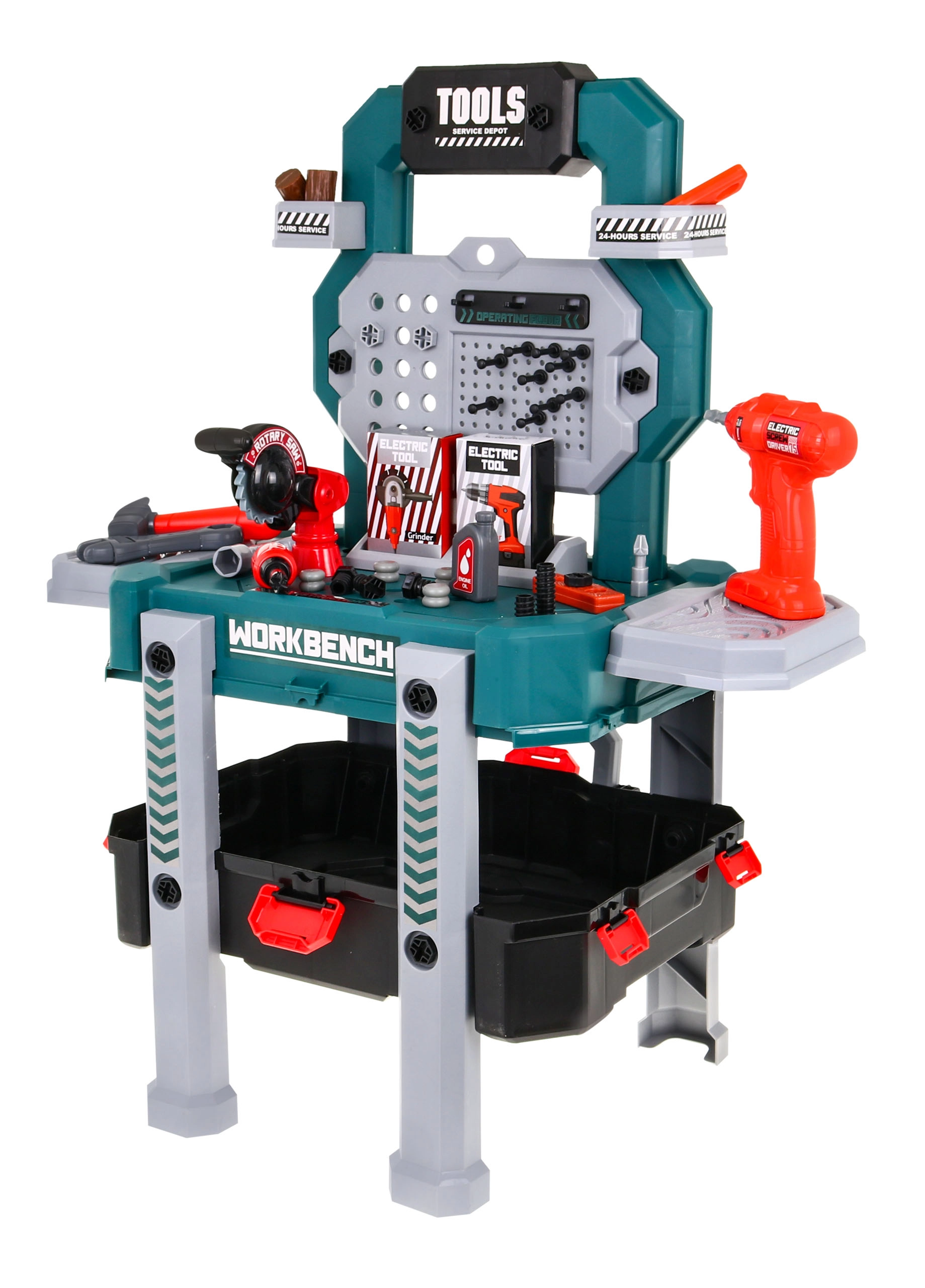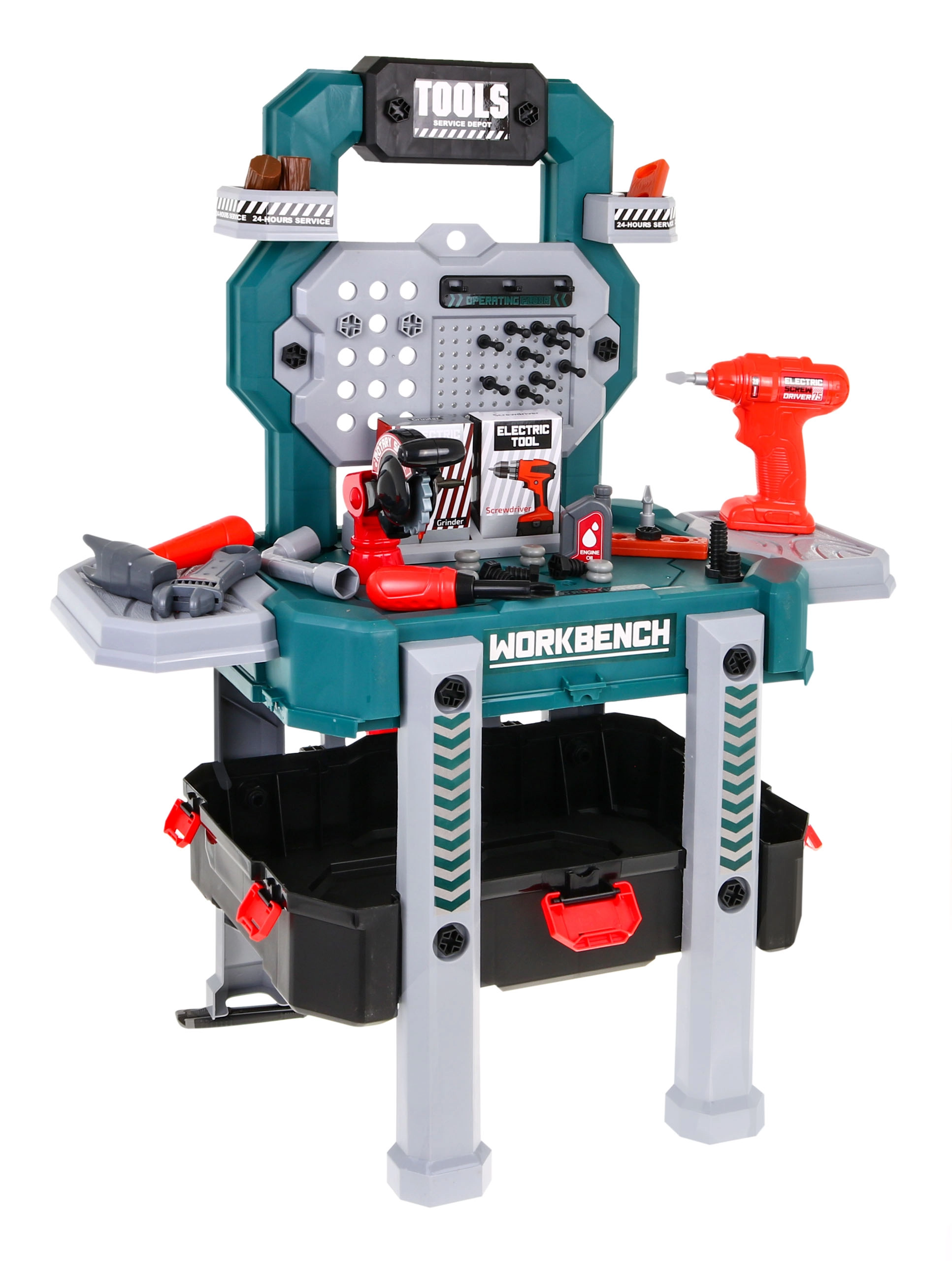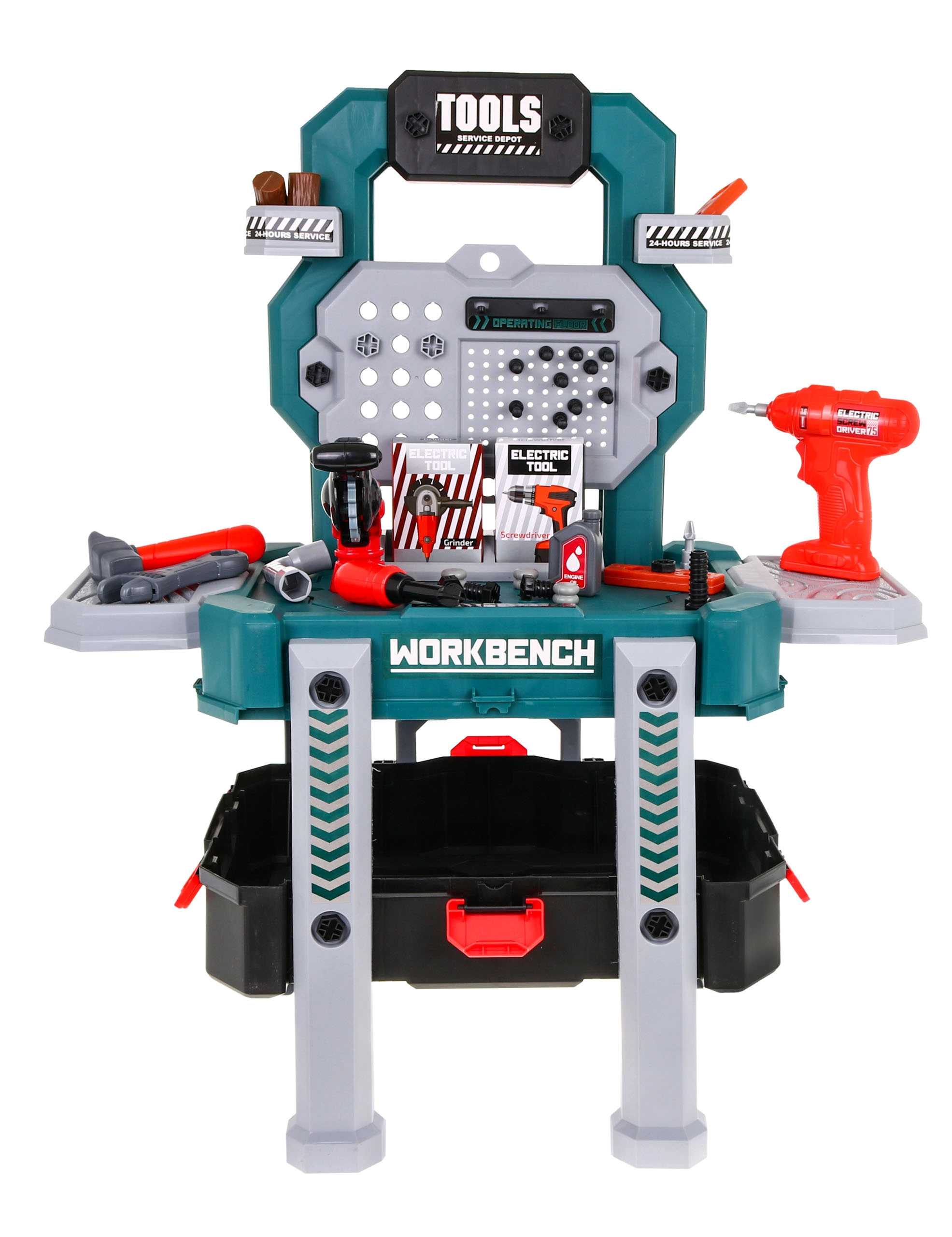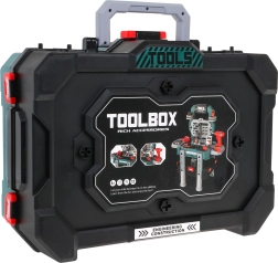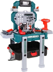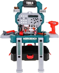 Descubre el versátil set de bricolaje que se transforma en segundos de un maletín portátil a un estable soporte de trabajo con compartimentos. Los niños disfrutarán con los sonidos reales del taladro-destornillador con dos puntas intercambiables y probarán a trabajar con herramientas de forma segura y lúdica.