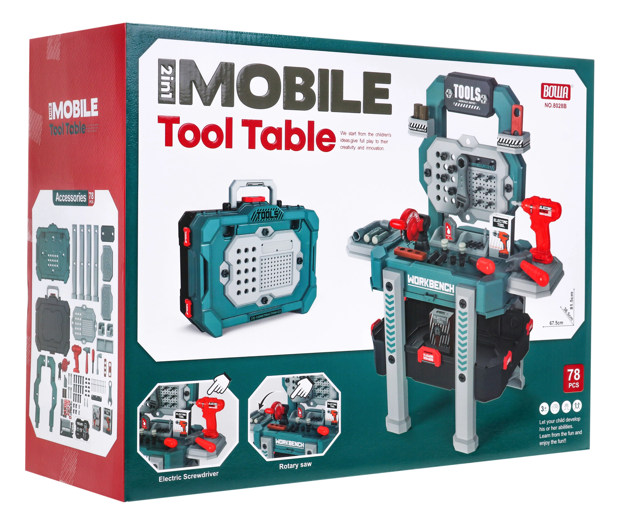 Incluye 78 piezas entre ellas sierrita, martillo, destornillador, llaves, tornillos y tablillas “de madera”. Al terminar, todo se guarda fácilmente en el gran maletín con asa. Ideal para desarrollar la motricidad fina, la creatividad y el juego de rol.