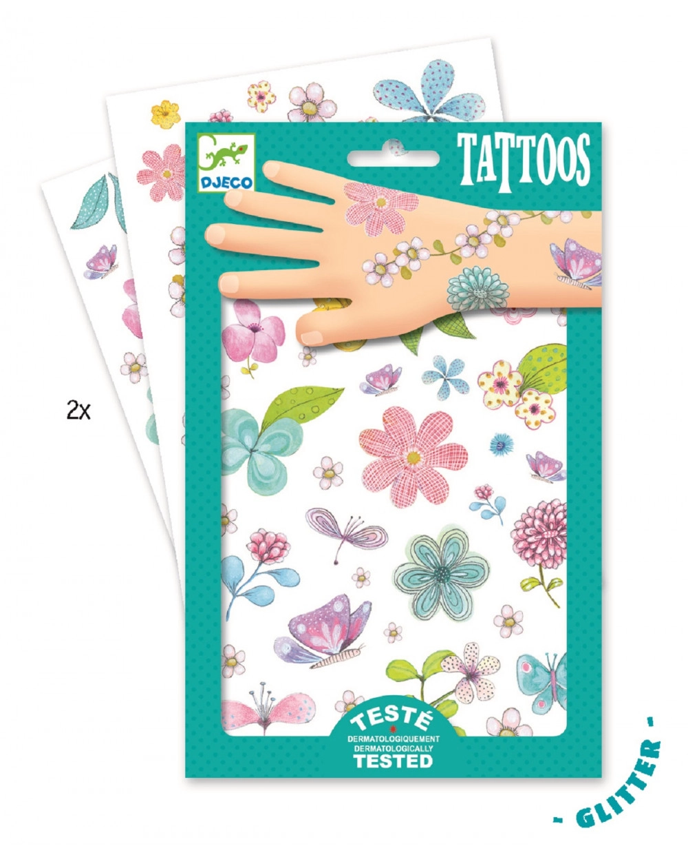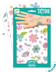 Decora la piel con divertidos motivos de la marca Djeco. Estos tatuajes temporales con motivos florales se aplican fácilmente con agua, tienen un efecto brillante, están dermatológicamente probados y el paquete incluye 2 láminas de 21 × 14 cm.