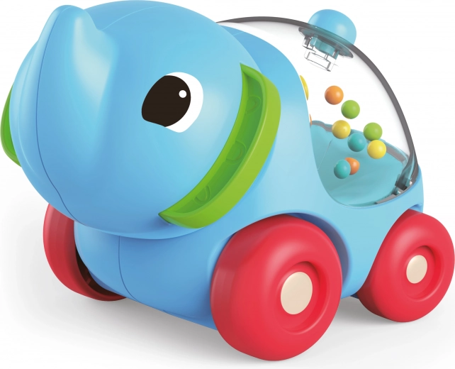 Este colorido sonajero-elefantito con ruedas es el primer cochecito ideal para bebés. Al moverse produce un sonido de cascabeleo que motiva a los niños a explorar, gatear y a empujar por primera vez el juguete delante de ellos.