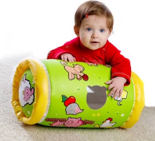 Divertido y seguro rodillo inflable para los más pequeños que favorece el gateo, la estabilidad y los primeros intentos de ponerse de pie. En su interior hay tres cascabeles que tintinean suavemente al moverse y motivan al niño a la actividad. El producto es libre de ftalatos y certificado, adecuado a partir de 6 meses.