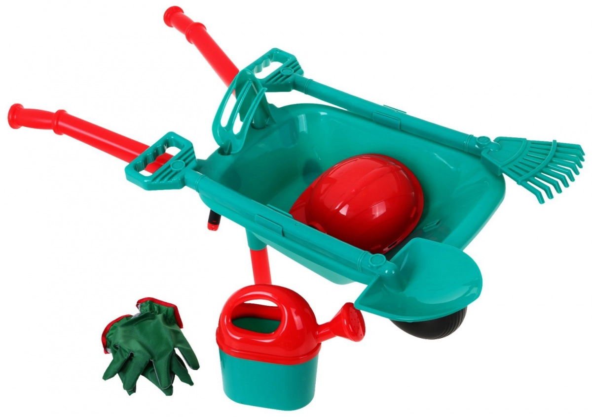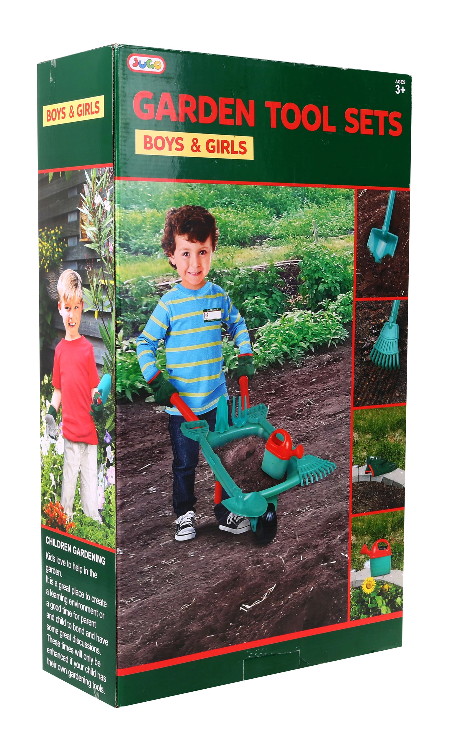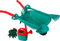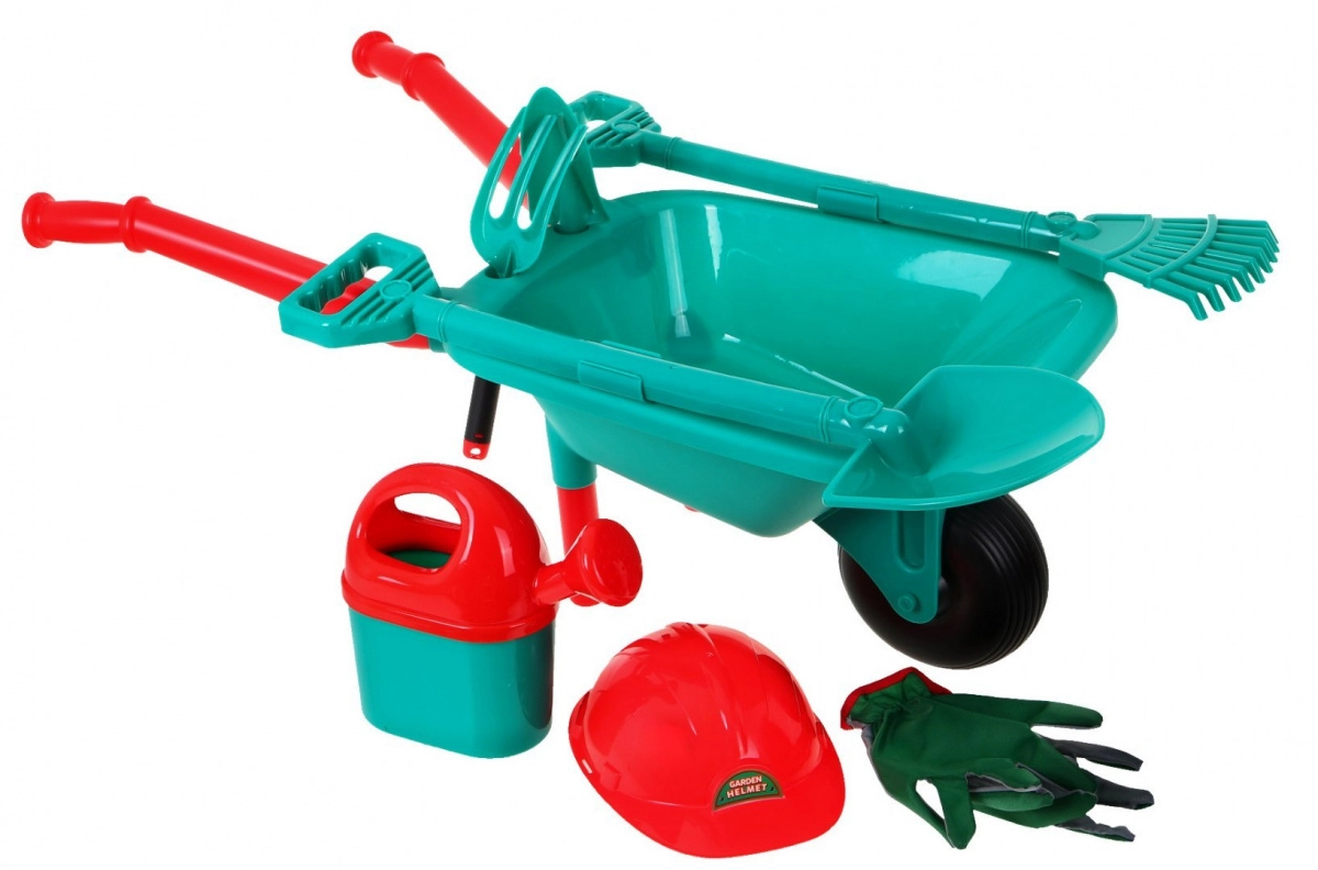 - Equipamiento completo para pequeños jardineros: carretilla, palas, rastrillo, horquilla, regadera, guantes.