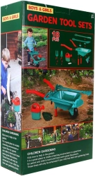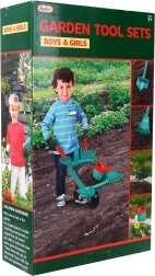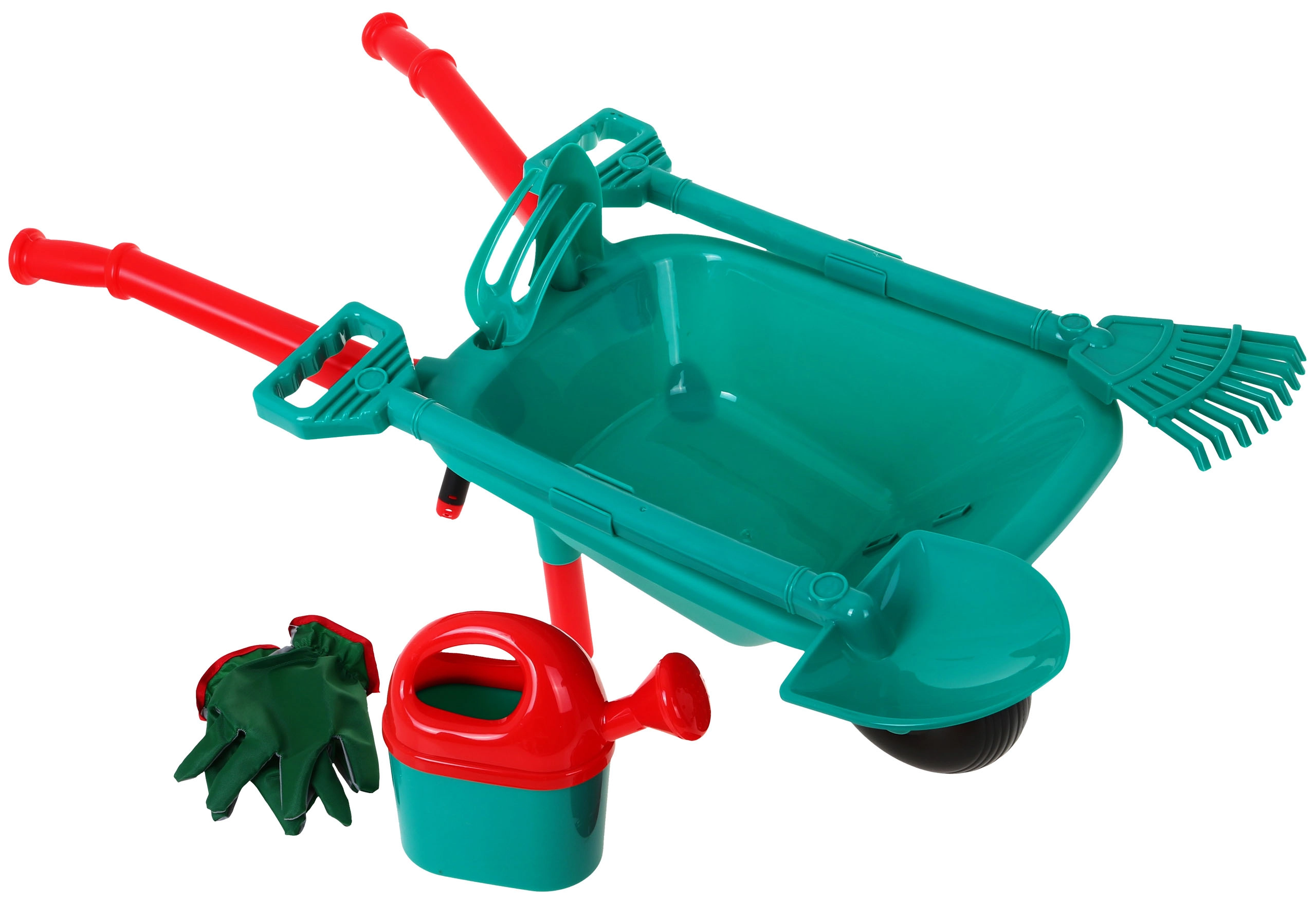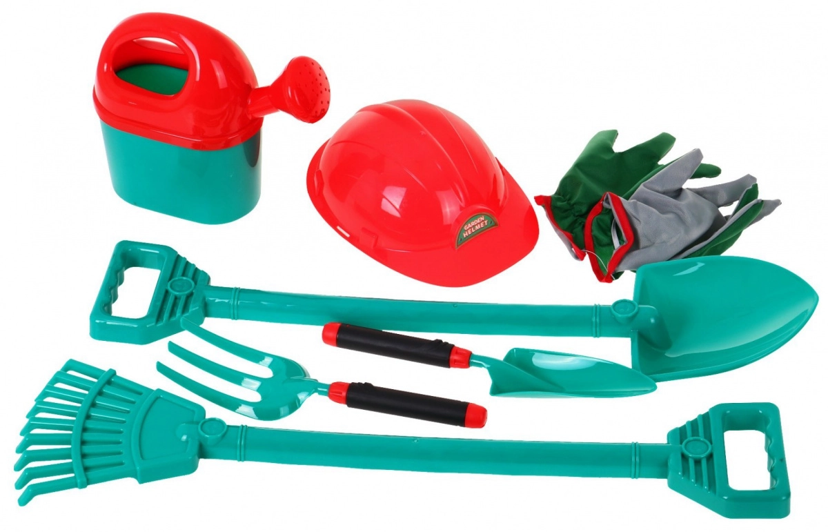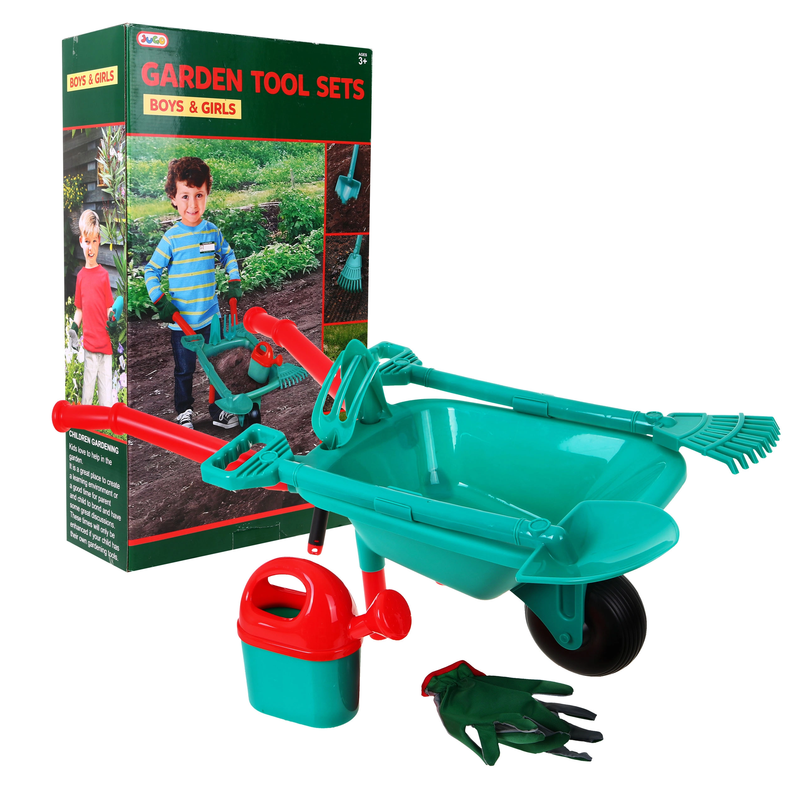 - Equipamiento completo para pequeños jardineros: carretilla, palas, rastrillo, horquilla, regadera, guantes.