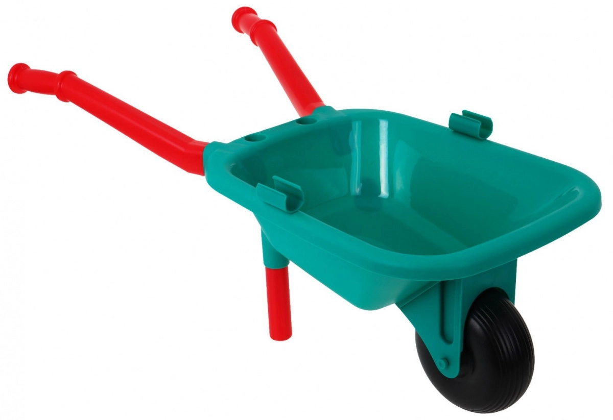 Carretilla infantil ligera con rueda robusta y empuñaduras cómodas que puede con hojas, tierra e incluso juguetes. Dispone de asas y soportes prácticos para fijar las herramientas, así todo estará a mano.