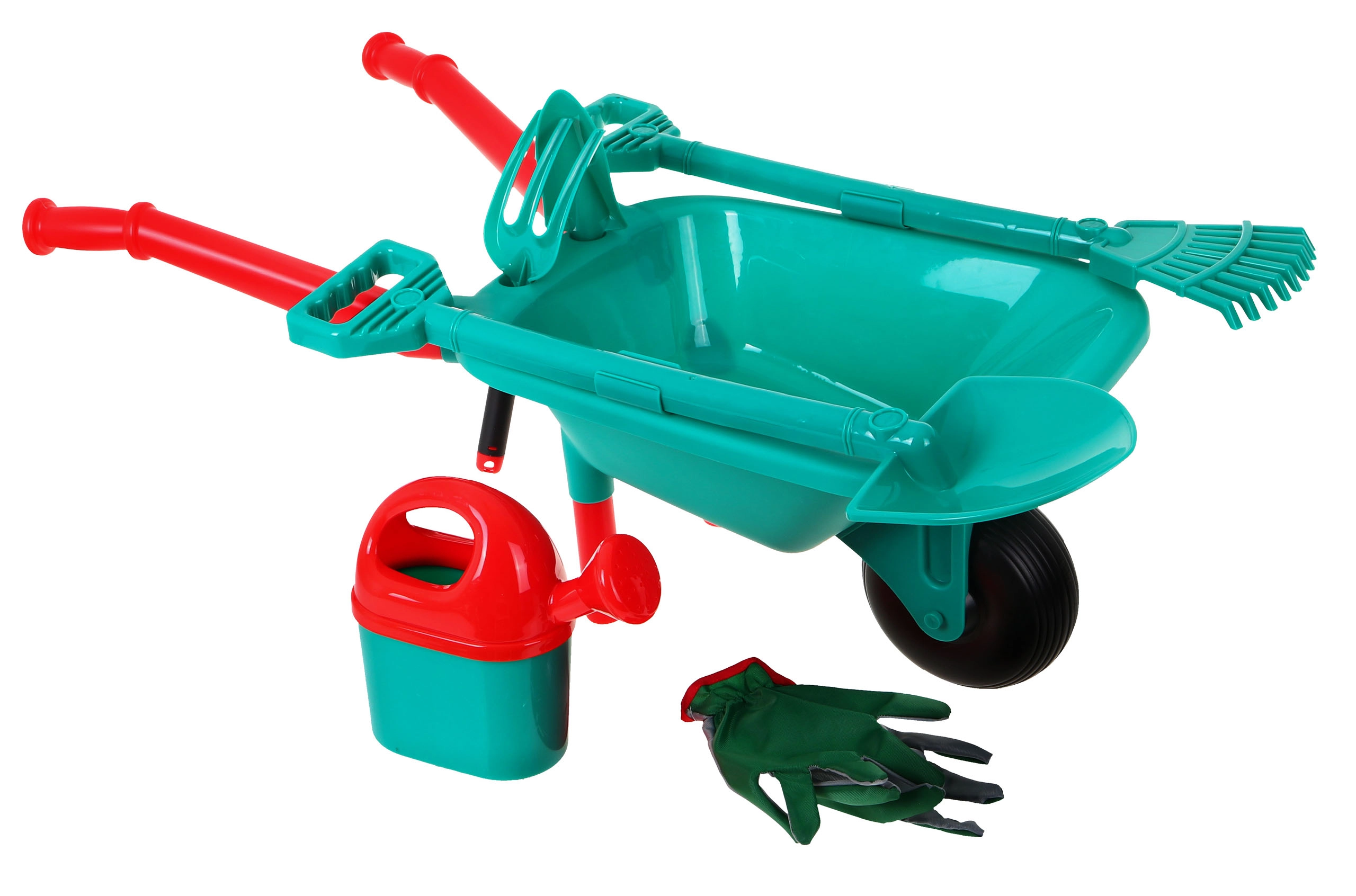 Este completo juego de jardinería permite a los niños participar en tareas como rastrillar hojas, trasplantar y regar. La carretilla con soportes tiene aberturas y ganchos prácticos para sujetar las herramientas, para que puedan llevarlo todo fácilmente. Gracias a su estructura de plástico ligera, las herramientas se manejan bien y sus colores llamativos atraen a primera vista.