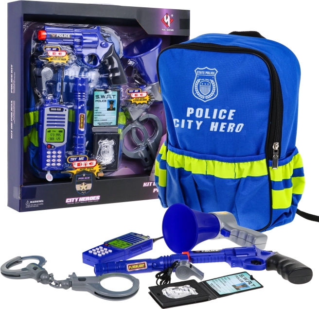 ¡Conviértete en el héroe de la ciudad con este set policial interactivo para niños a partir de 3 años! Incluye una mochila espaciosa, una pistola con sonido de disparo, un megáfono, una radio de onda corta con efectos de luz y sonido y una linterna funcional. Todo listo para jugar de inmediato: el paquete incluye pilas 6× AG13.
