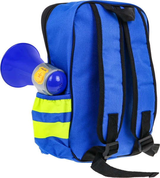 Los bolsillos laterales de la mochila albergan el megáfono, la radio y la linterna para que el pequeño policía esté siempre listo para actuar.