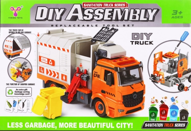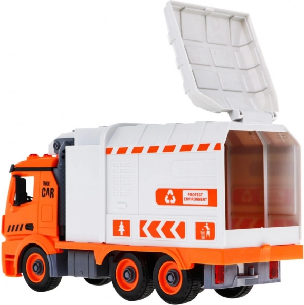 Con un destornillador con puntas intercambiables, el niño puede desmontar y montar el camión. El brazo lateral eleva y vacía los contenedores como en un camión de basura real.