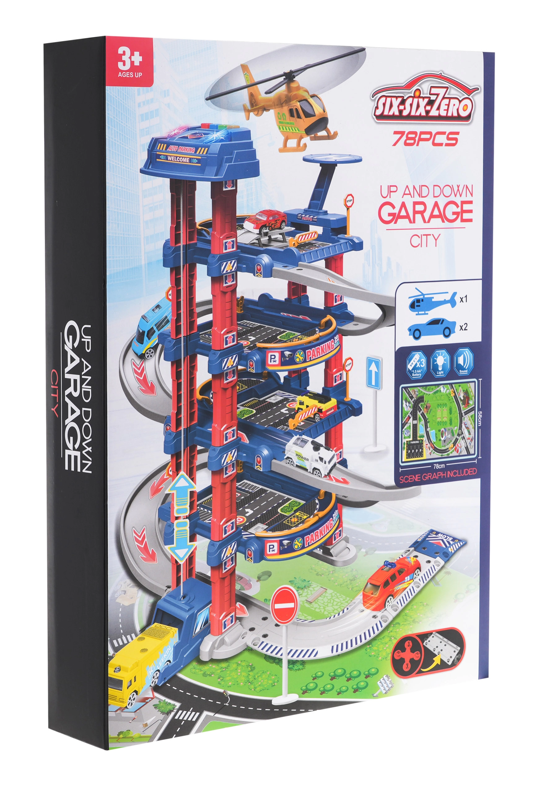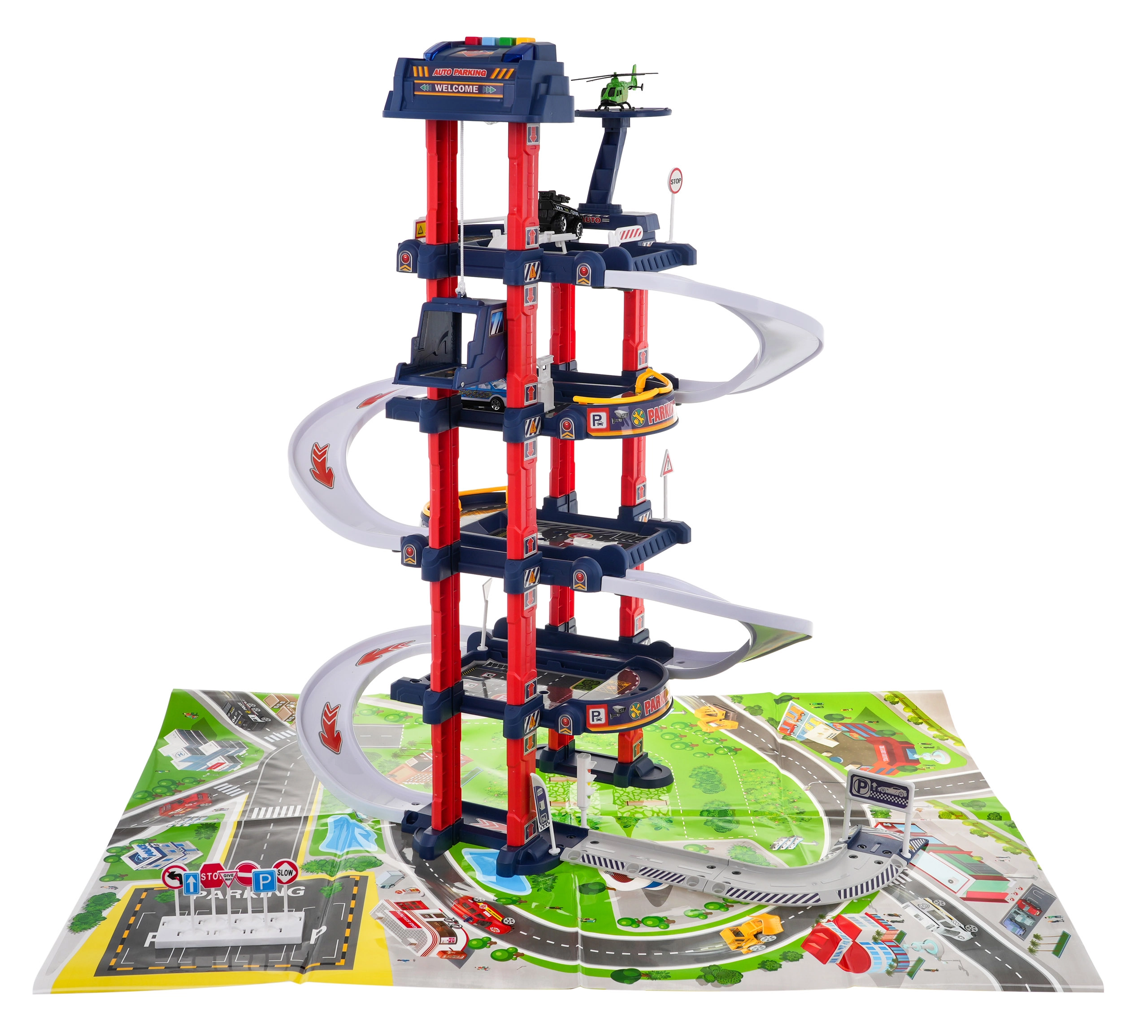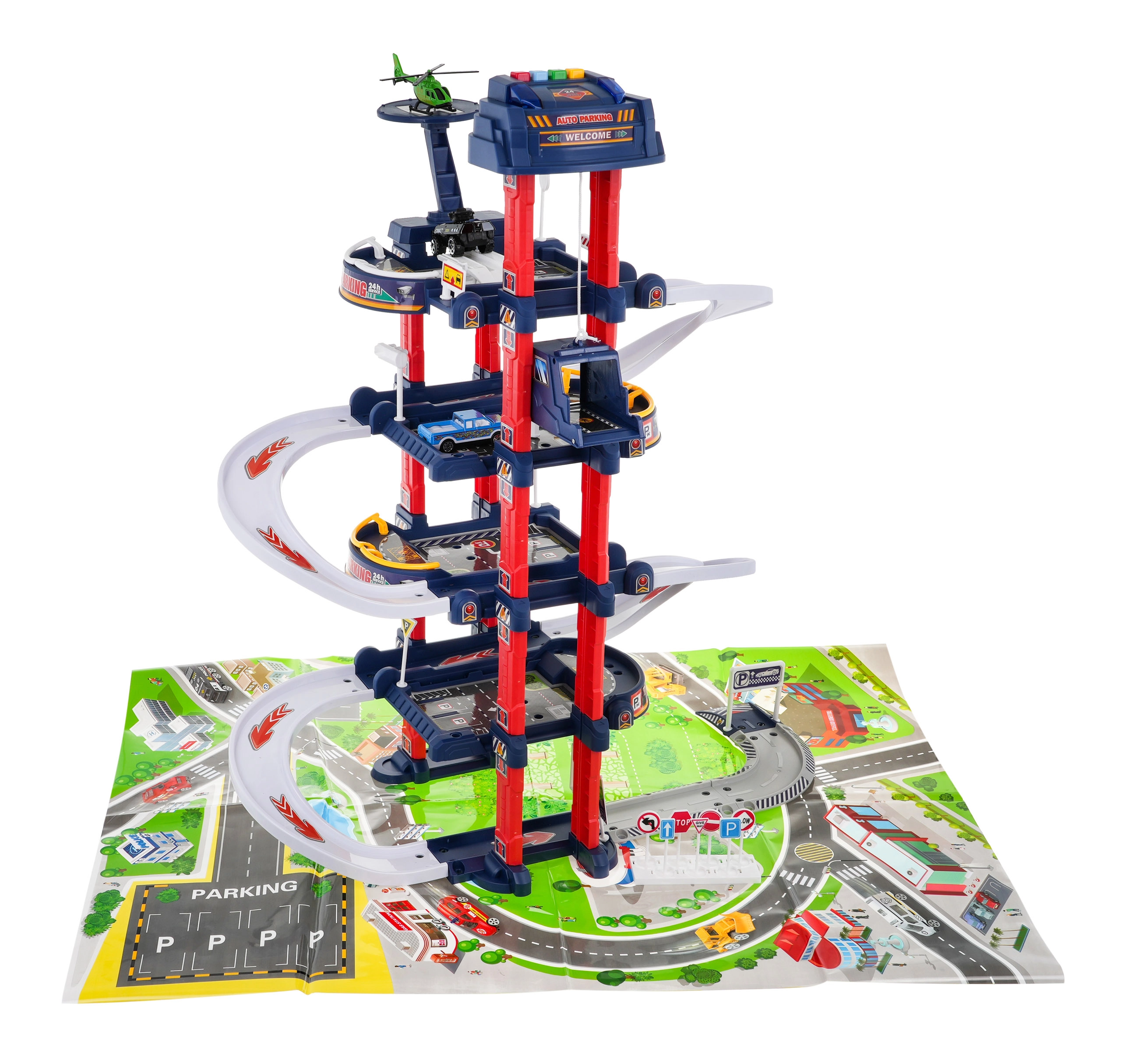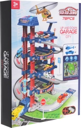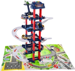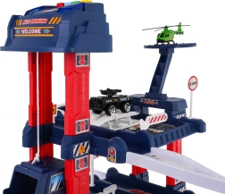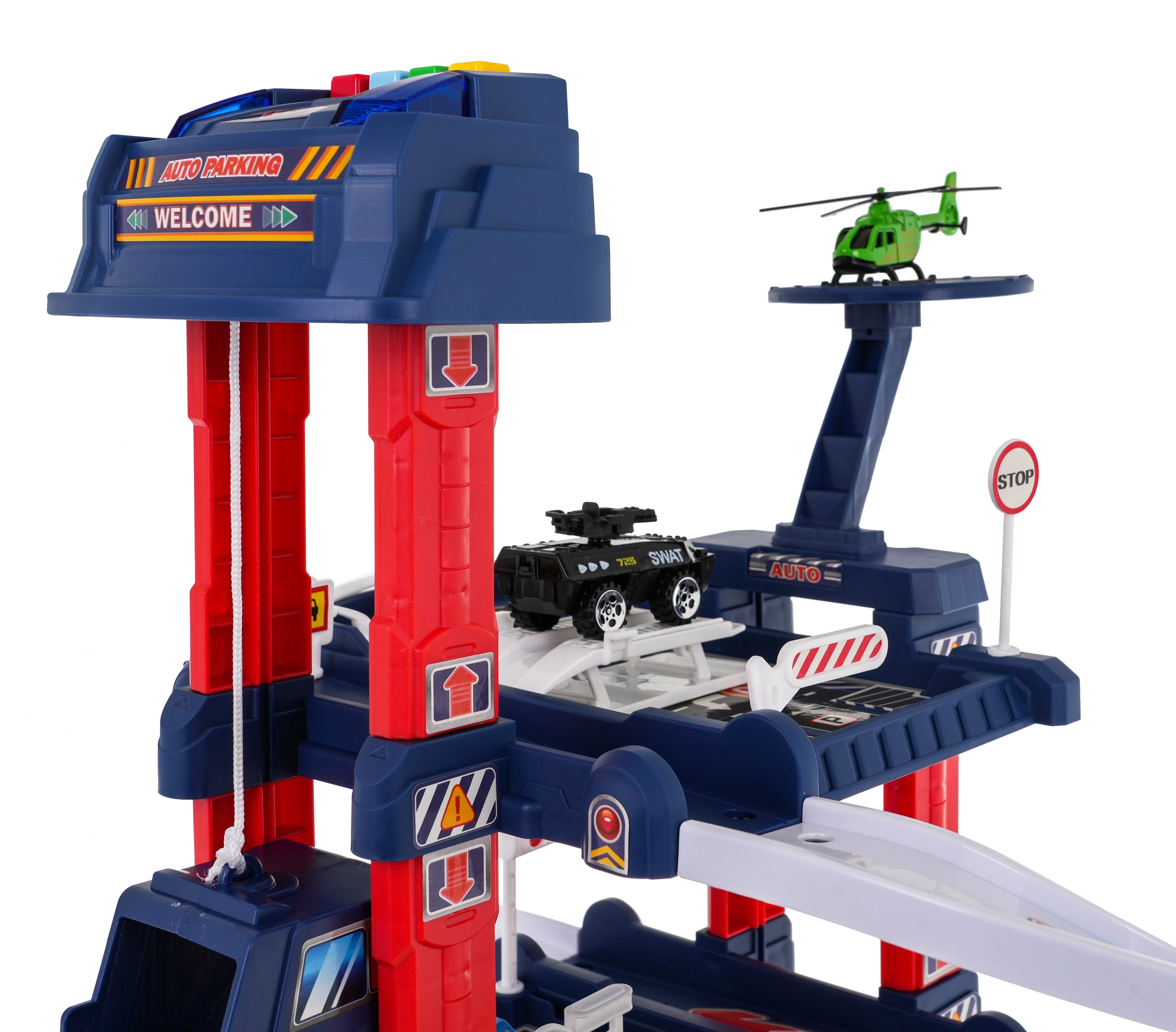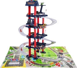 El aparcamiento multinivel ofrece plazas de estacionamiento, gasolinera, elevador para coches y heliopuerto. El panel de control con botones de colores maneja el ascensor y activa los efectos: el botón rojo baja el ascensor, el amarillo lo sube. El botón azul reproduce sonidos de policía, bomberos, ambulancia, arranque del motor y disparos; el botón verde activa el claxon. En el panel parpadean luces azules y rojas que intensifican la atmósfera de juego.