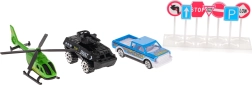 - piezas de construcción del aparcamiento, alfombra de juego, 2 coches de metal, helicóptero, 7 señales de tráfico, pegatinas decorativas, manual ilustrado