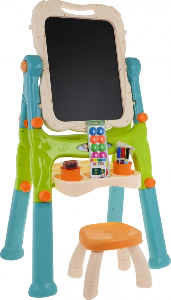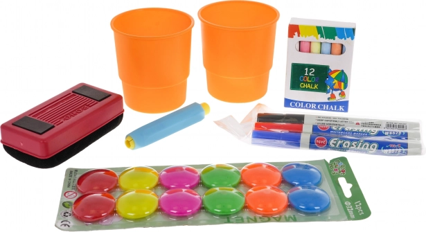 - Set completo – taburete, repisa, rotuladores, tizas, imanes, vasos, borrador y pinzas.