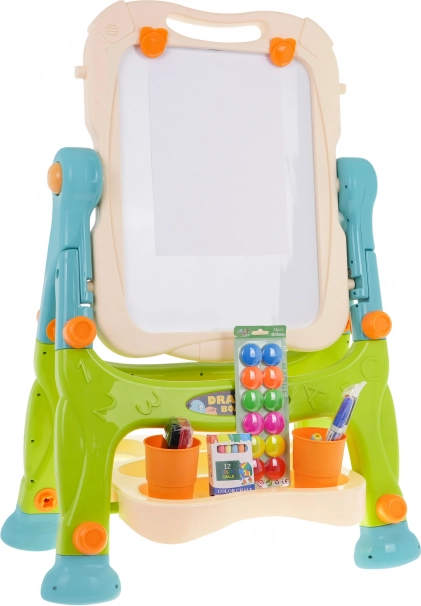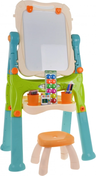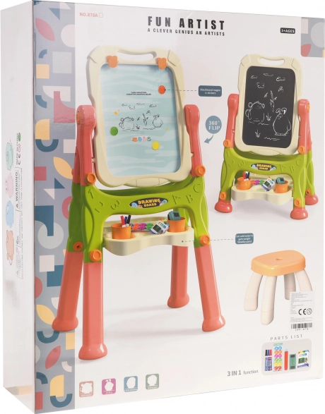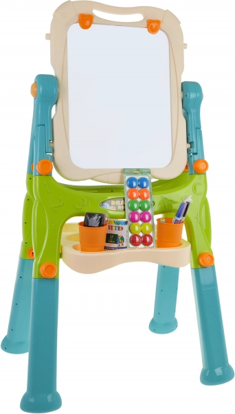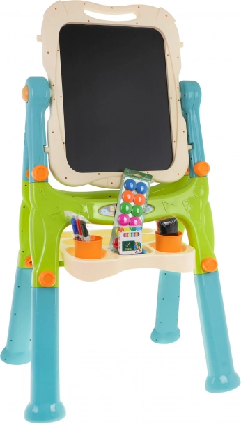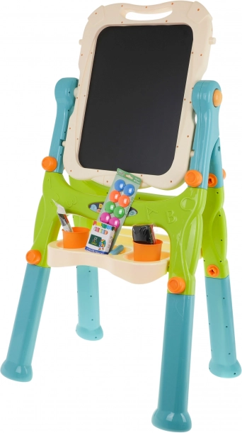 Este set creativo combina una pizarra blanca magnética para escribir con rotuladores y fijar imanes con una superficie negra de tiza para el dibujo clásico. La pizarra gira 360°, tiene bordes redondeados para un uso seguro y, gracias a las patas intercambiables largas y cortas, se adapta fácilmente a la altura actual del niño. La práctica repisa mantiene todos los materiales a mano y las pinzas integradas permiten pintar también sobre papel.