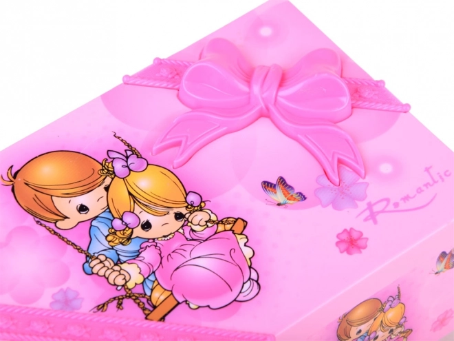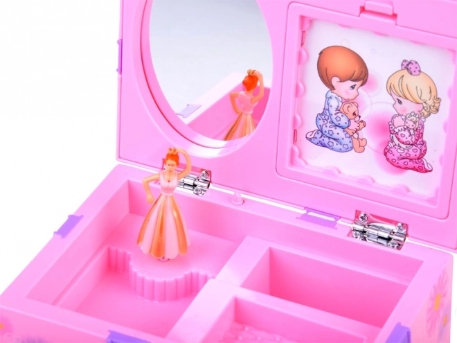 Este encantador joyero en tonos rosas está adornado con flores y dulces ilustraciones de una niña y un niño. Al abrirlo, la bailarina empieza a girar y suena una melodía agradable que crea un ambiente de cuento para el arreglo diario y el guardado de las joyas.