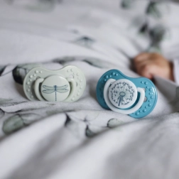 El set incluye 2 chupetes con motivos naturales y un estuche de plástico para un almacenamiento higiénico en casa y de viaje.