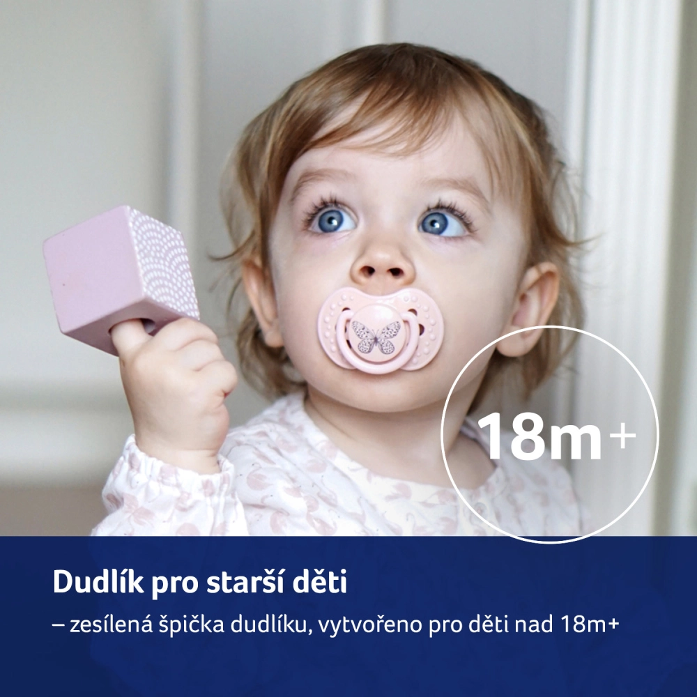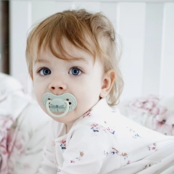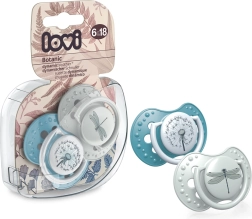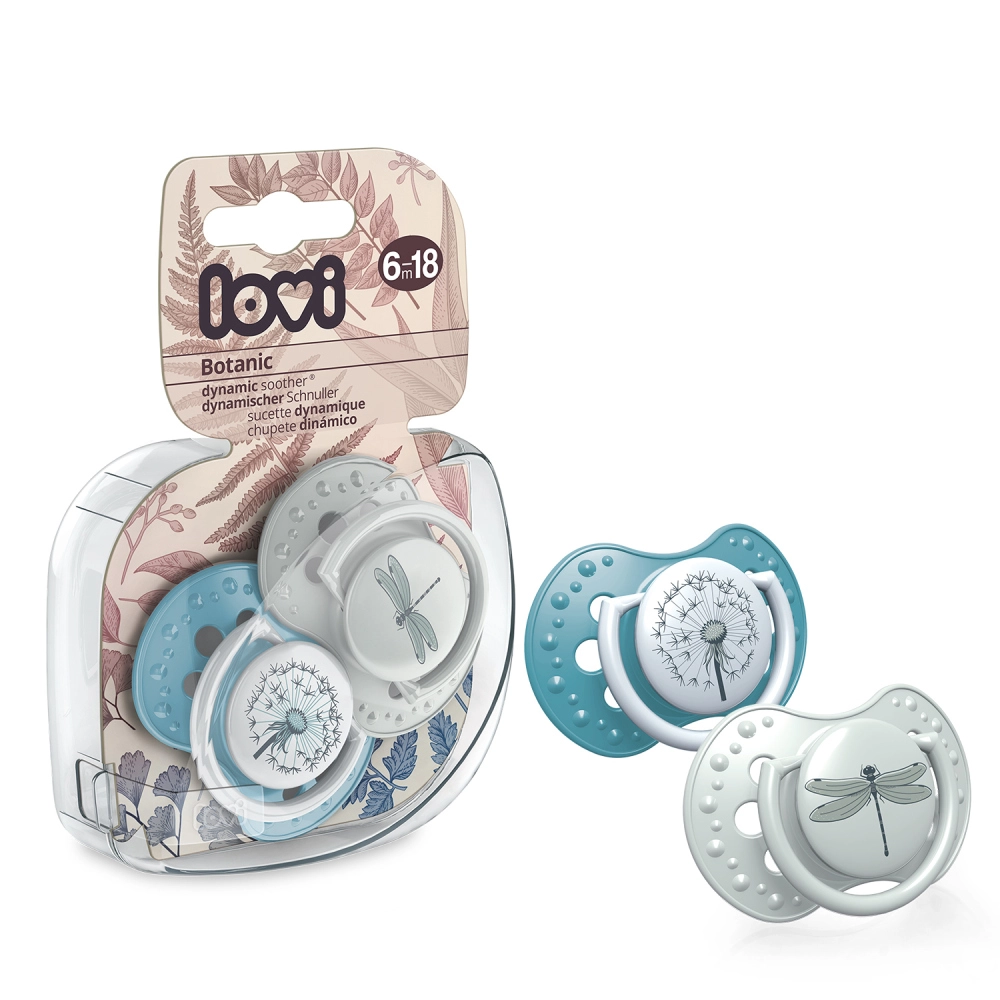 Los chupetes LOVI fueron desarrollados junto con especialistas en logopedia para mantener el reflejo de succión correcto y favorecer el desarrollo saludable de la mordida y el habla. La tetina dinámica simétrica de capas de silicona se adapta al ritmo de succión y no deforma el paladar. La silicona es insípida e inodora, fácil de mantener limpia y no contiene BPA.
