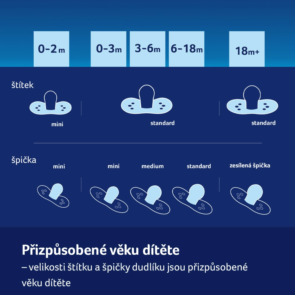 - Tetina dinámica: previene el reflejo de mordida, favorece la deglución natural y la correcta formación de la mordida.