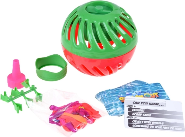El juego Splash Out ofrece una mecánica sencilla y diversión máxima: llena los globos con agua, colócalos en la bola de dos piezas con temporizador, da cuerda al tiempo y empieza a responder. Pasa la bola hasta que el tiempo se agote: entonces el globo estalla y ¡alguien se mojará! Las cartas con preguntas (en inglés) estimulan la creatividad y el pensamiento rápido.