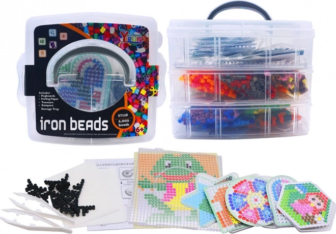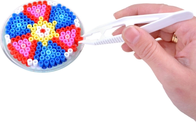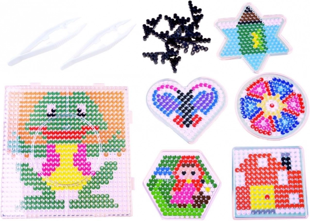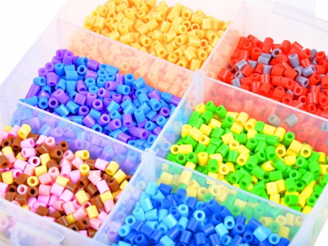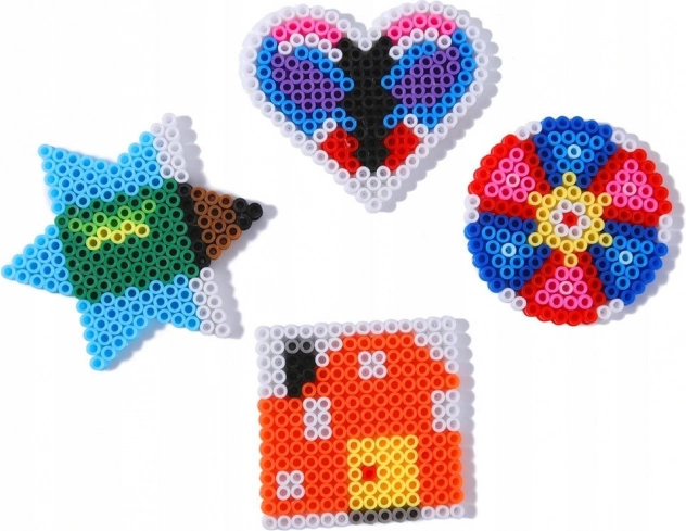 - aprox. 6000 cuentas termofusibles, 6 plantillas, 10 bases, 12 sobres con cuentas de varios colores, 2 pinzas, 2 papeles de pergamino, caja organizadora con compartimentos