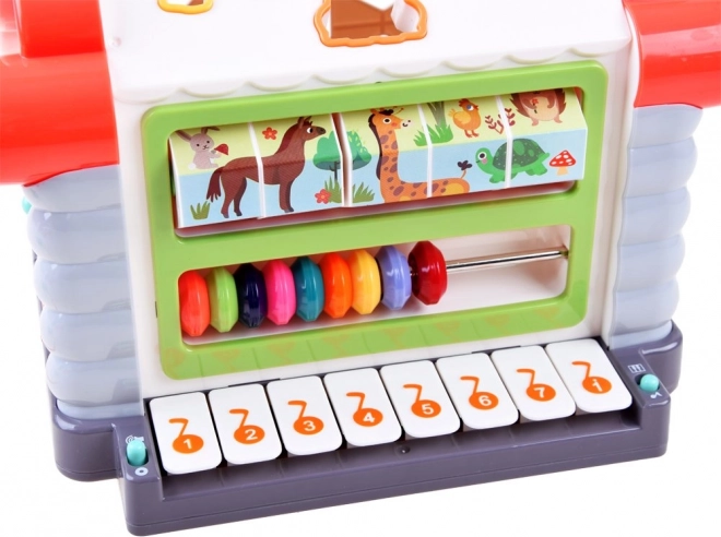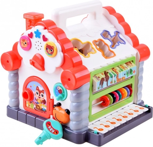 Esta casita de descubrimiento está fabricada en plástico de alta calidad y resistencia, en colores atractivos. Ofrece ricas funciones interactivas: al insertar la pieza correcta suena el sonido del animal correspondiente, el mini teclado reproduce la escala y 7 melodías favoritas, y el contador apoya los primeros conteos. Gracias a la llave y las puertas, los niños entrenan la motricidad fina y la coordinación mano–ojo.