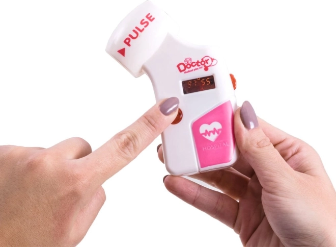 Estetoscopio con corazón intermitente, termómetro y tensiómetro con valores iluminados, otoscopio, jeringa, tijeras, martillo y otros accesorios.