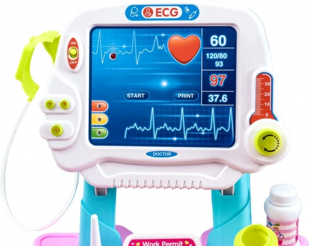 El panel interactivo con efectos (luces y sonidos) simula la monitorización del paciente, mientras que elementos funcionales, como el “corazoncito intermitente” del estetoscopio o los valores iluminados del termómetro y el tensiómetro, hacen el juego aún más inmersivo. El carro con ruedas permite transportar fácilmente todo el set.