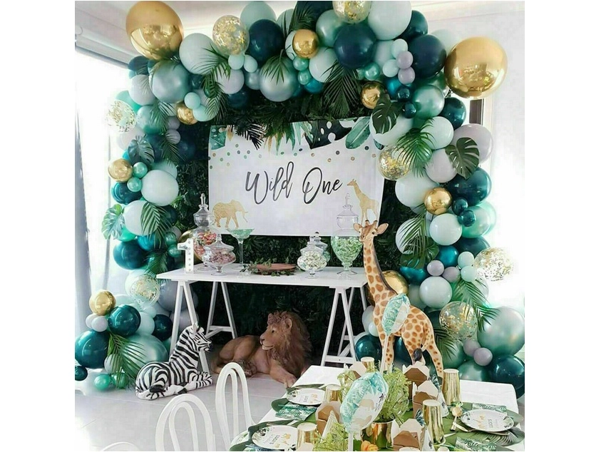 El montaje es sencillo: infla los globos con aire o helio y fíjalos a la tira con ojetes. Distribuye los globos más pequeños alrededor para un efecto lleno y por capas. Las hojas tropicales y de palma aportan un toque exótico y combinan a la perfección con la paleta verde y dorada.
