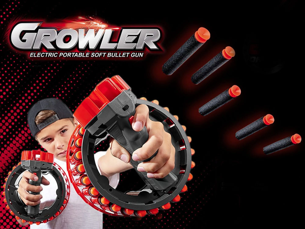 Disfruta de la acción con el set de dos blásteres eléctricos GROWLER. El diseño circular y compacto con cargador giratorio admite hasta 28 dardos de espuma por bláster y permite disparo rápido, tanto tiro a tiro como en ráfagas, con un alcance aproximado de 10 m. Incluye baterías recargables de 3,7 V y cables USB para una carga sencilla. Los dardos EVA con ventosa se adhieren muy bien a superficies lisas.