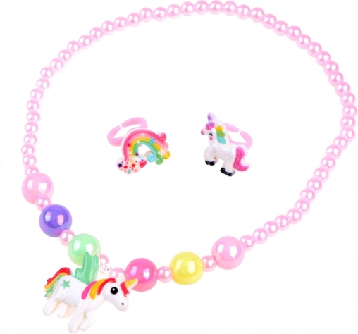 Un collar de cuentas de colores con colgante de unicornio y dos anillos completan el disfraz y fomentan el juego mágico.