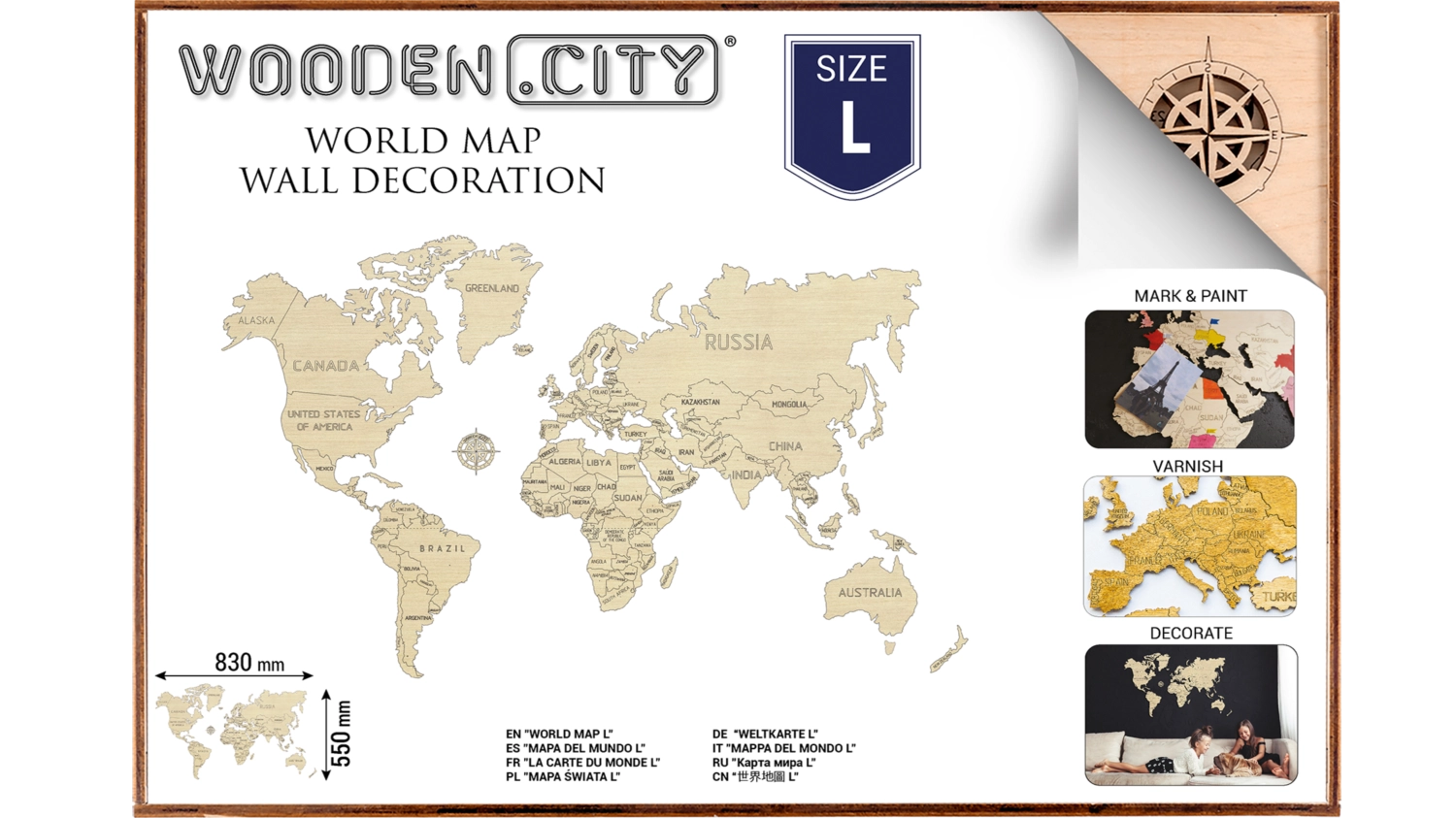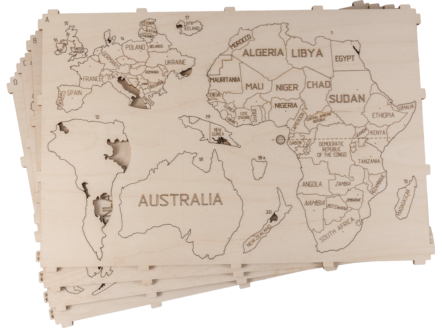 El mapa está cortado en contrachapado de abedul, lo que aporta al interior un aspecto natural y elegante.