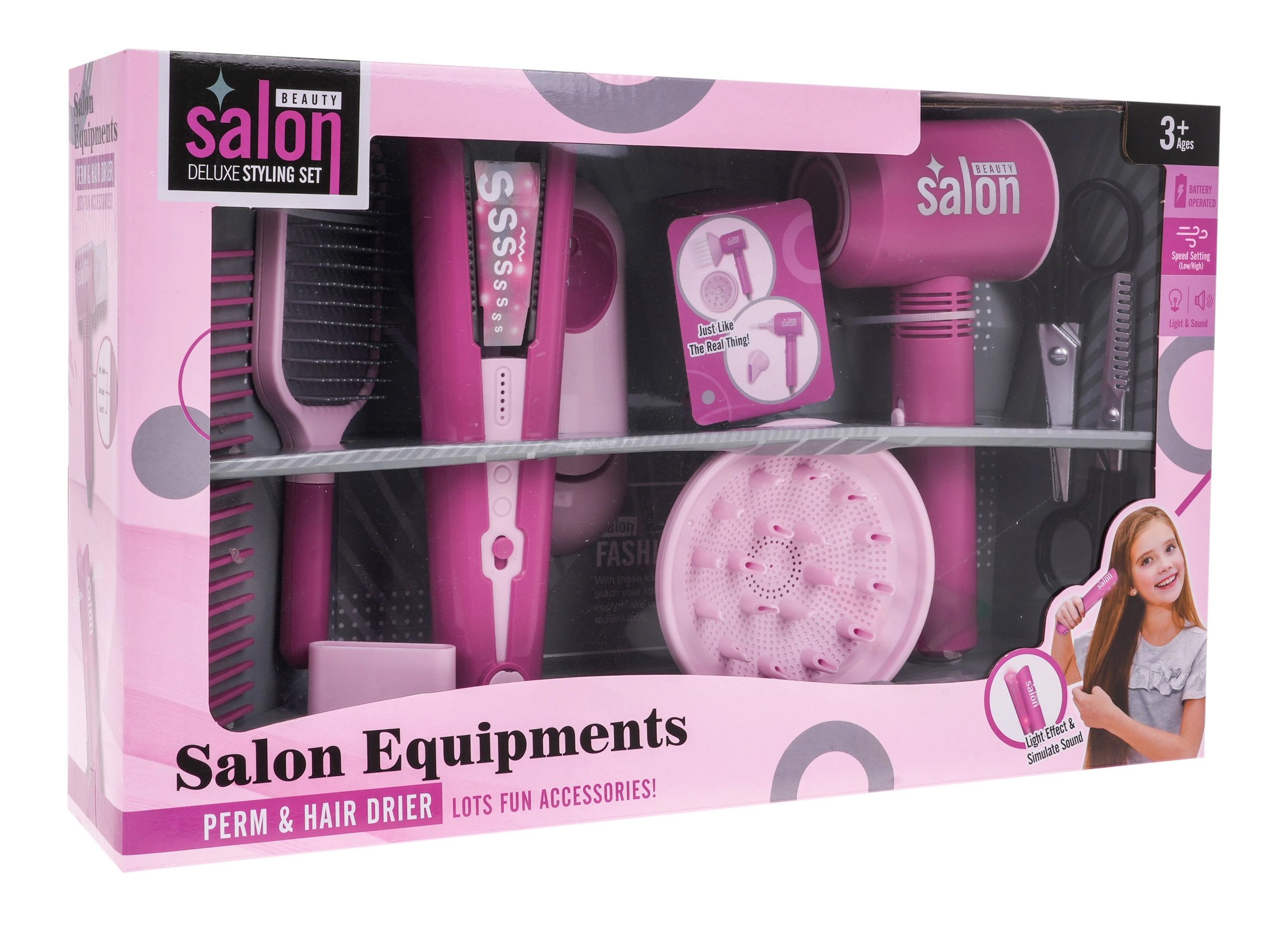 Descubre un divertido set de peluquería infantil para pequeños estilistas a partir de 3 años. Incluye un secador funcional a pilas con boquillas intercambiables y una plancha para el cabello con luz y sonido. El set ofrece abundantes accesorios como tijeras, peine, cepillo y soporte. El secador sopla aire, tiene 2 niveles de potencia y emite sonidos reales de secado. La plancha con efectos de luz y sonido aporta aún más autenticidad al juego de peluquería.