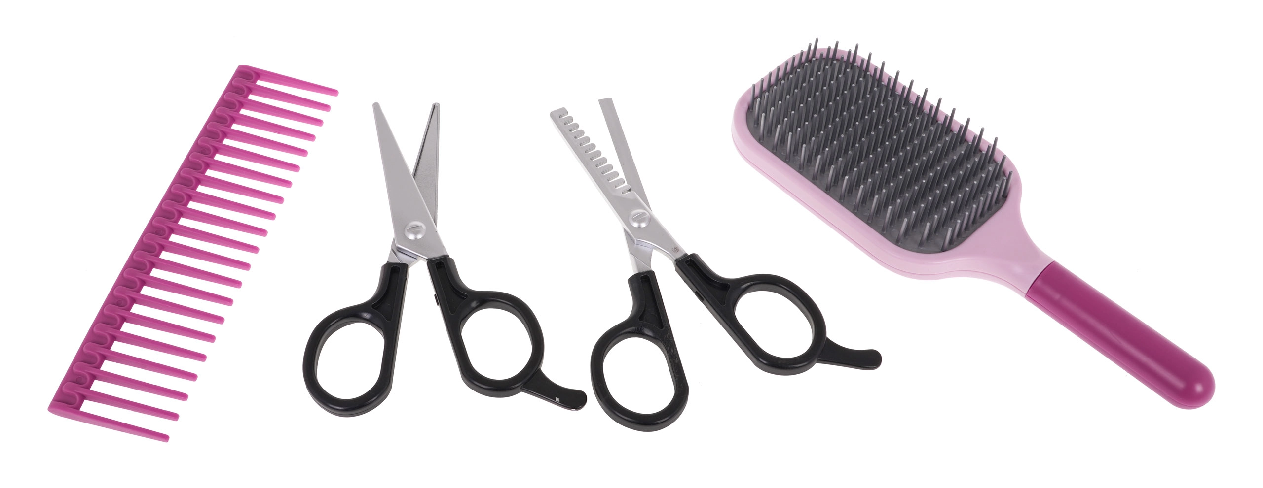 En el paquete encontrarás tijeras, tijeras de entresacar, peine, cepillo y un soporte para el secador, para tenerlo todo siempre a mano y listo para el siguiente peinado.