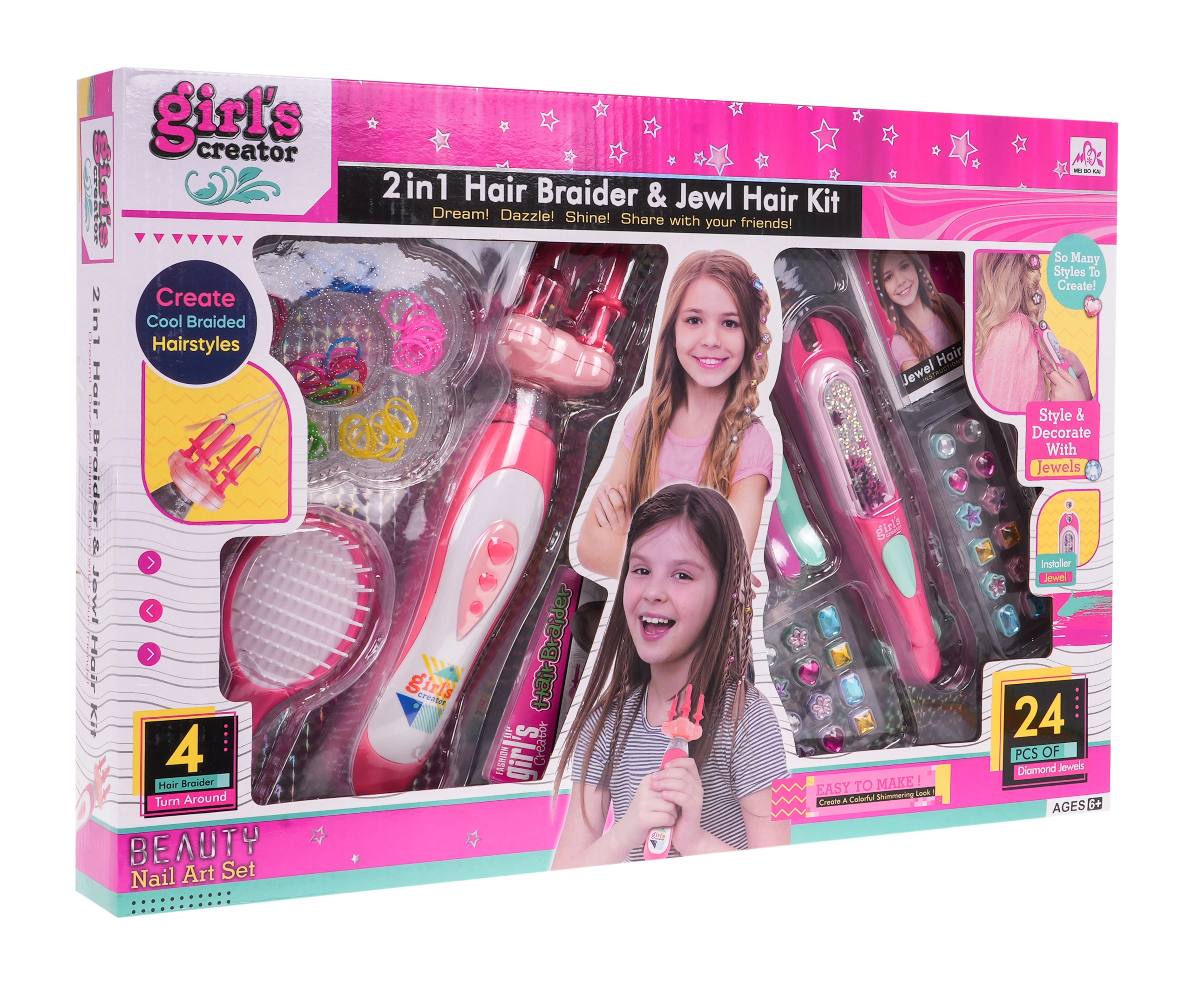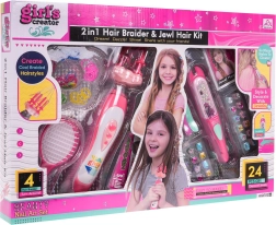 Descubre la diversión creativa con el set para hacer trenzas y decorar el cabello para niños a partir de 6 años. El set incluye una máquina para trenzar de 3 mechones, un aplicador de bisutería para el cabello, un cepillo, adornos tipo diamante y gomas de colores. Gracias al manejo sencillo y a los abundantes accesorios, los niños crearán fácilmente peinados originales llenos de color y brillo.