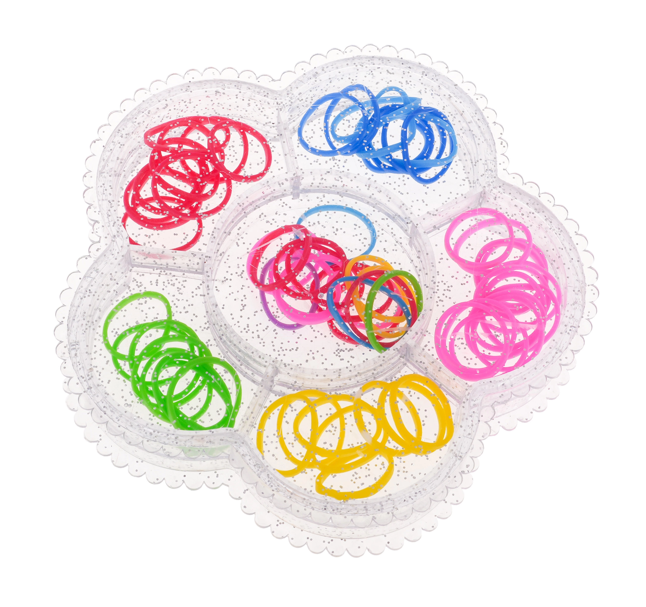 Incluye un estuche en forma de flor con compartimentos y 64 gomas de colores: orden y selección rápida del color para cada peinado.