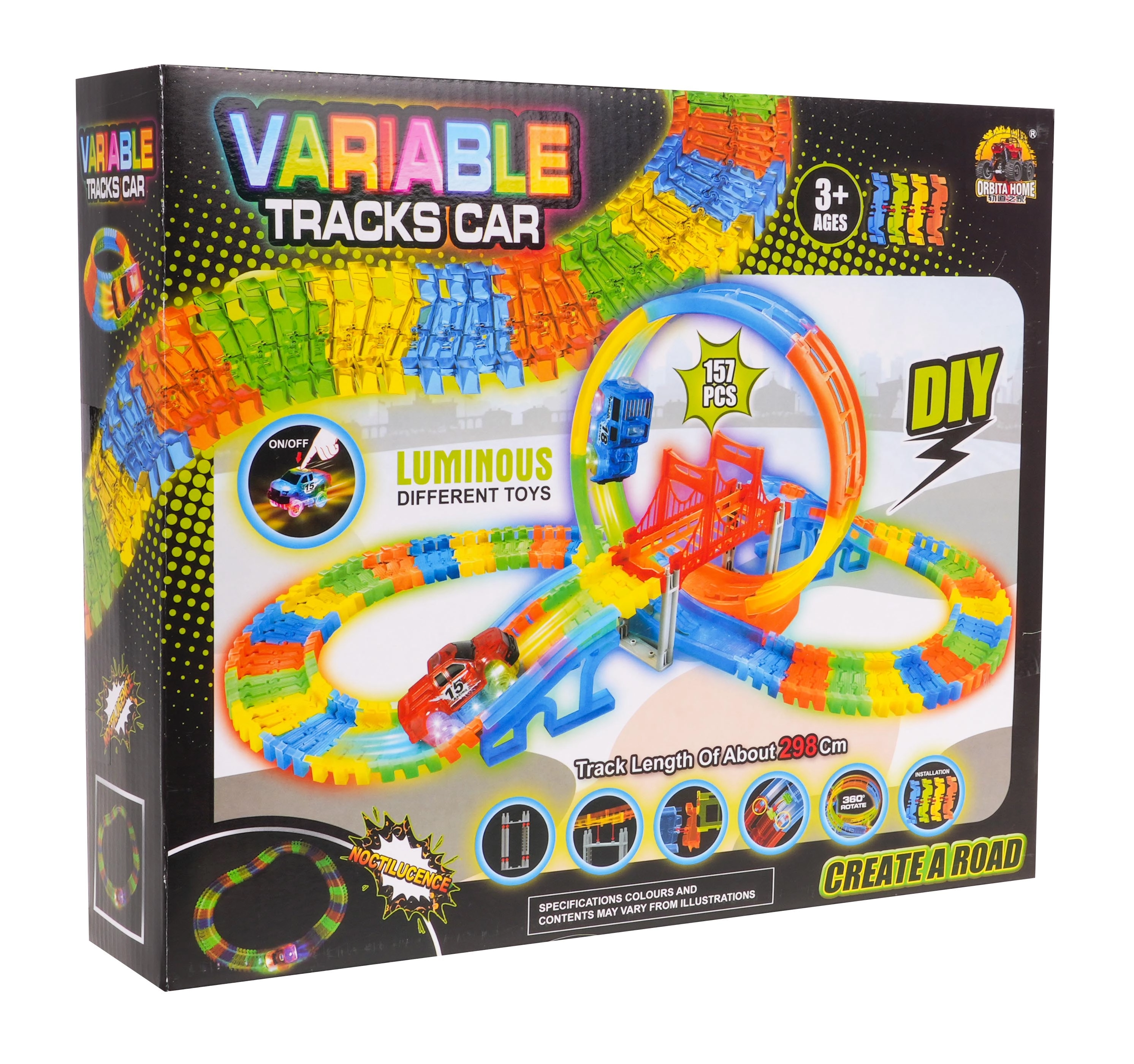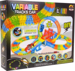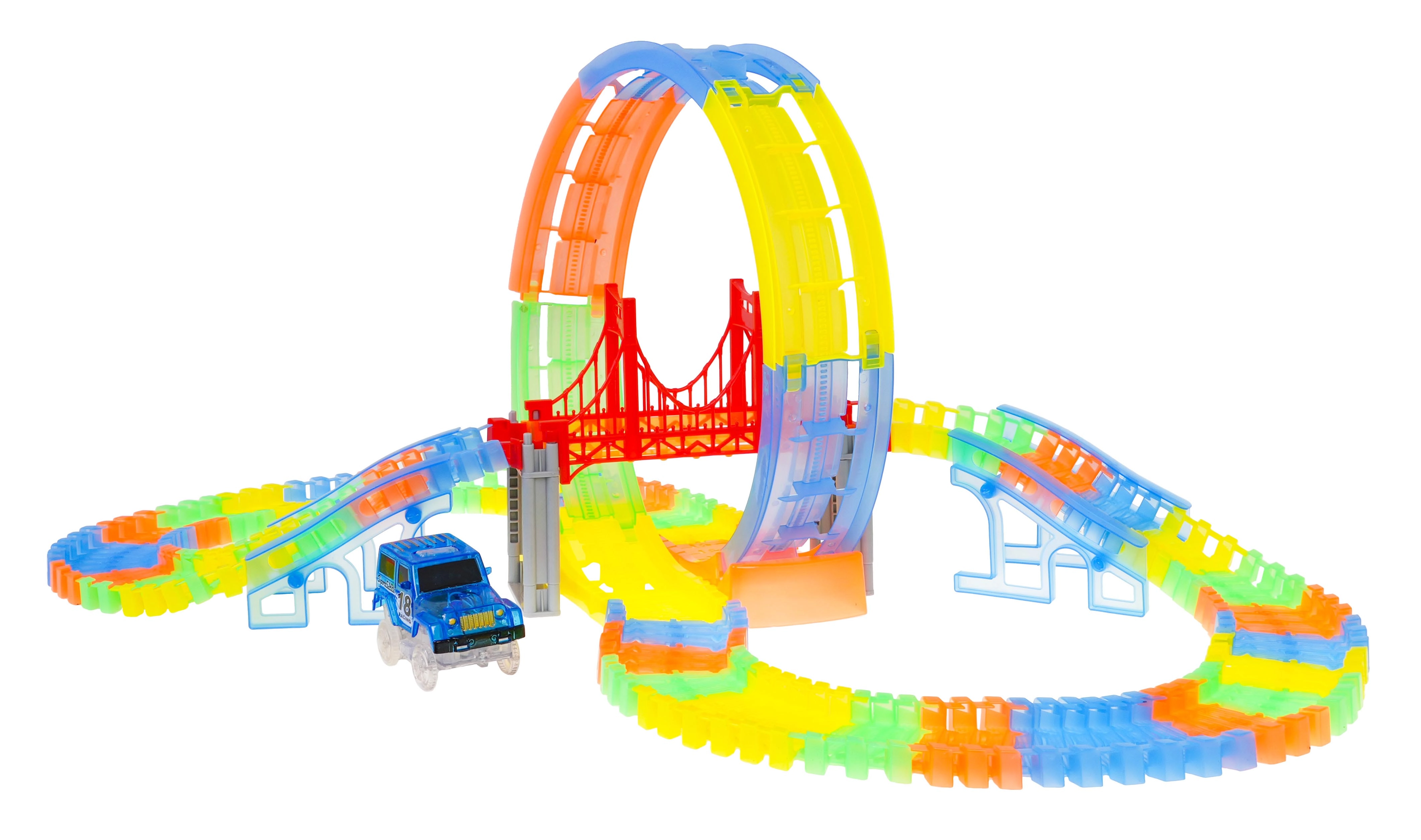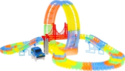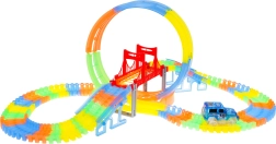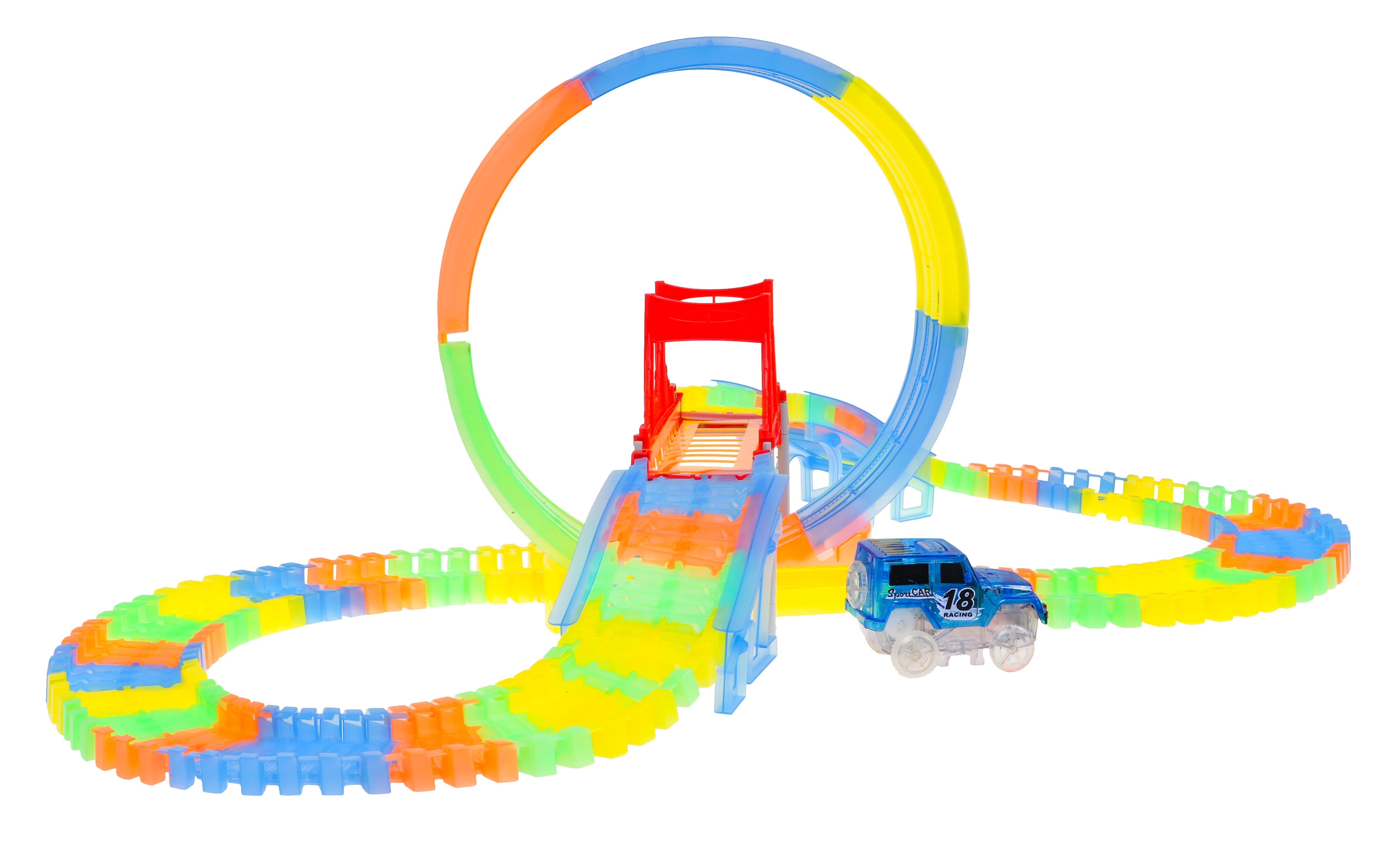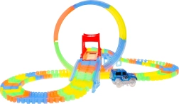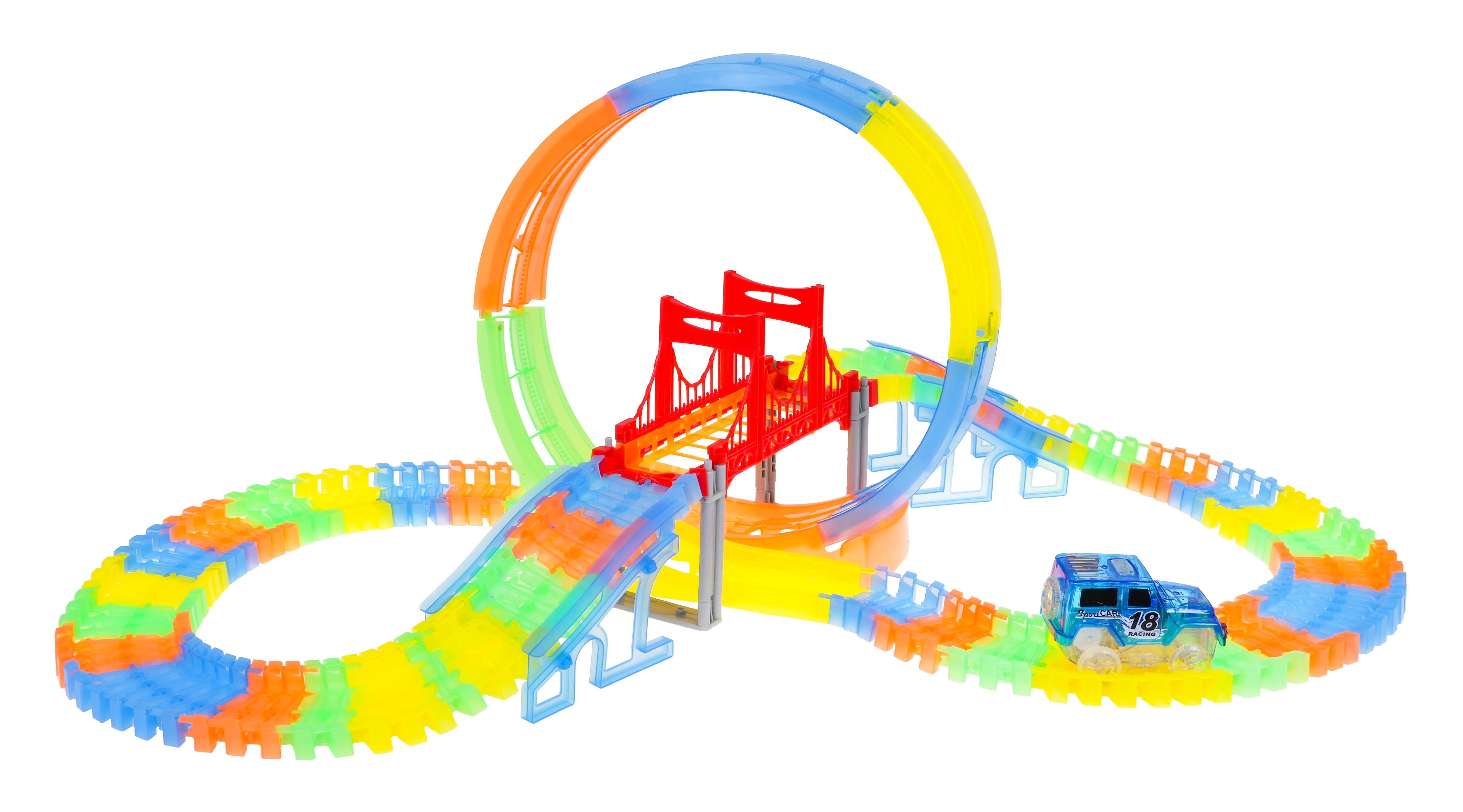 Esta colorida pista de carreras brilla en la oscuridad gracias a las piezas fluorescentes y al coche con LED incluido. Las piezas se encajan fácilmente entre sí; puedes girarlas, elevarlas y reordenarlas incluso durante la conducción para crear nuevas pistas con bucle de 360°, puentes y rampas. ¡Solo hay que pulsar el botón del techo del coche y que empiece la carrera!