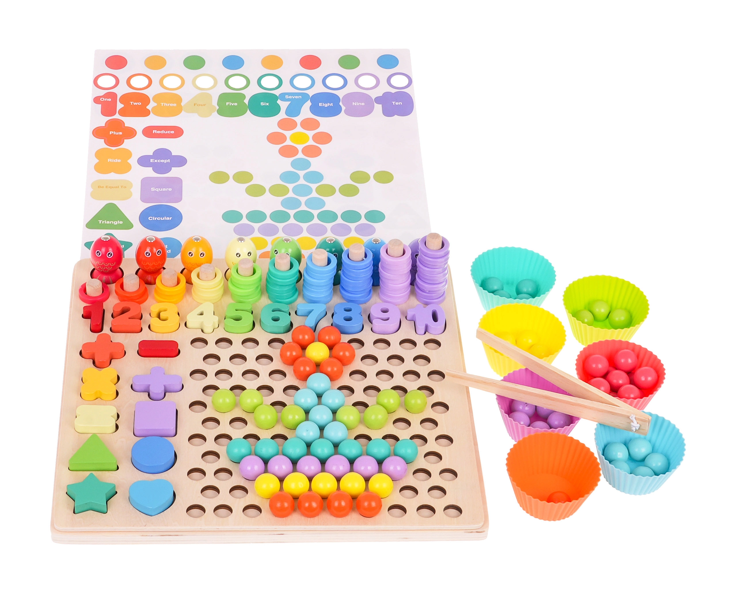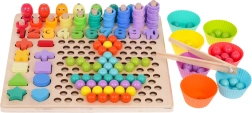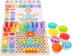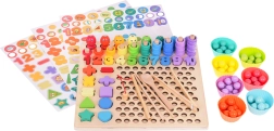 Gracias a las plantillas de doble cara, los niños pueden componer patrones con bolitas y anillas, entrenar la clasificación y la comparación, y afianzar de forma natural las bases del conteo. La base de madera de alta calidad es resistente y segura, ideal tanto para el aprendizaje en casa como para educación infantil.