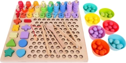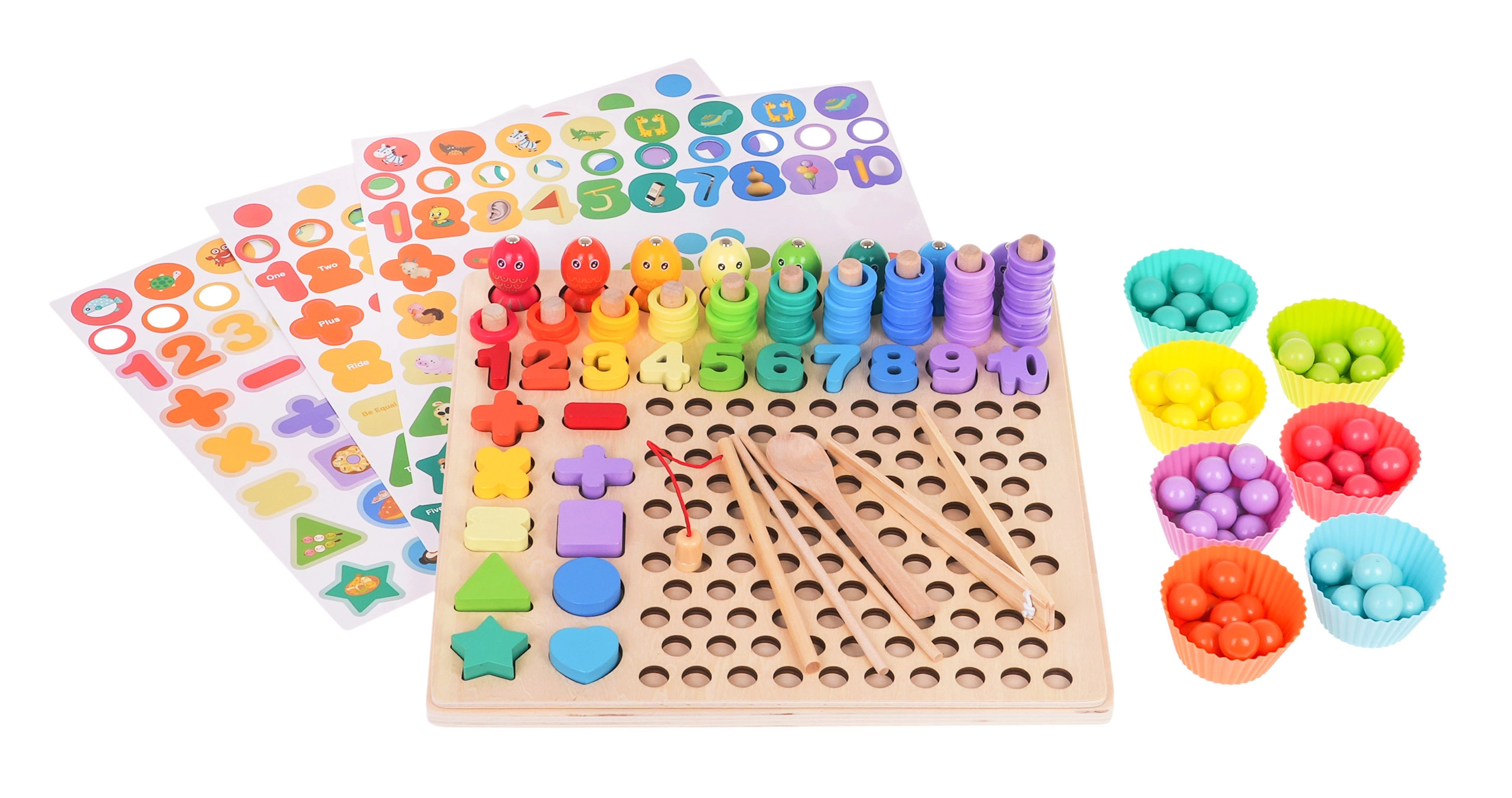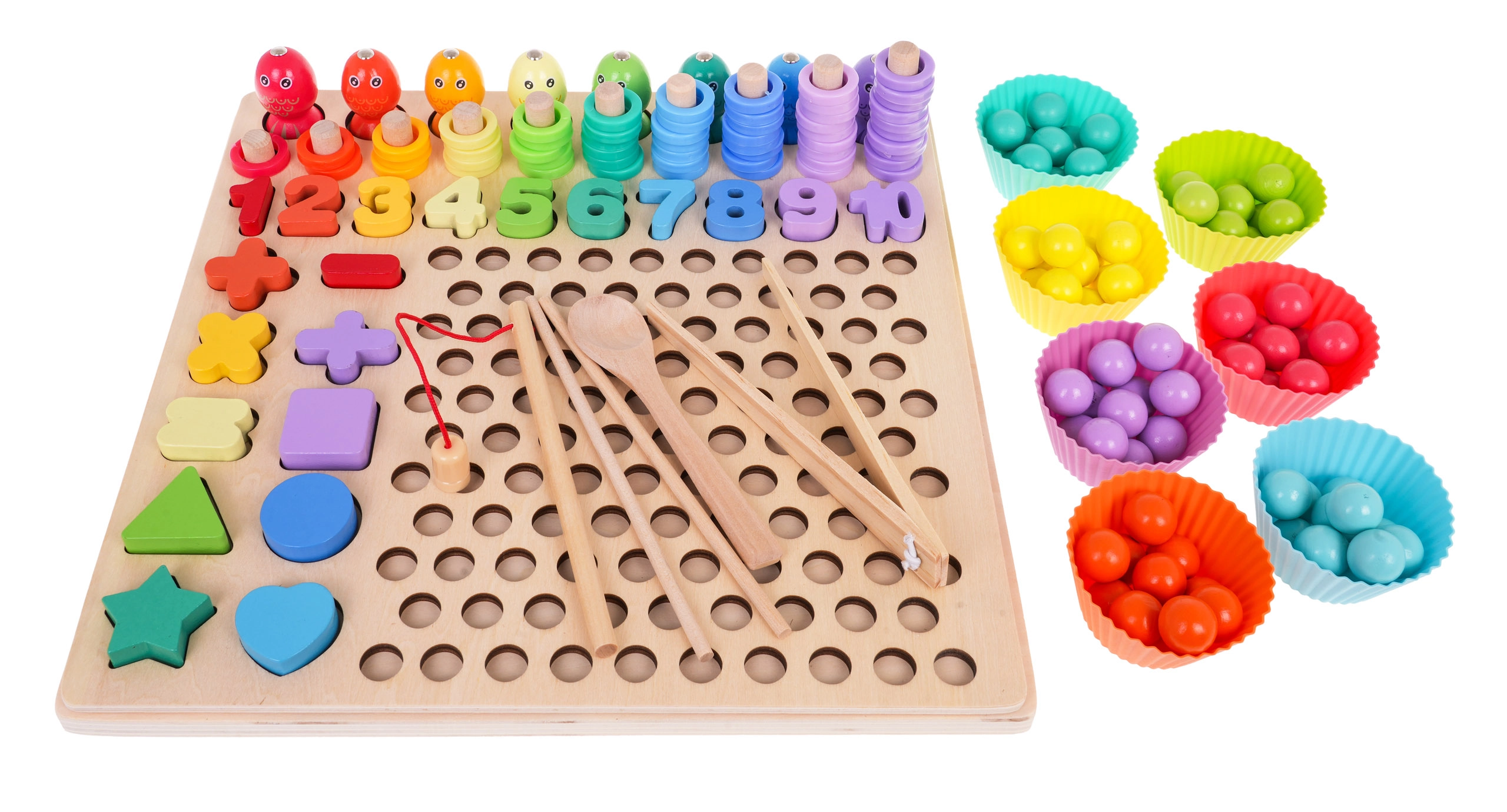 - base de madera y estructura con orificios, 3 plantillas de doble cara, 7 vasitos, pinza, caña, cucharita, 2 palitos, 8 peces magnéticos, 5 signos matemáticos, cifras 1–10, 5 formas (cuadrado, triángulo, círculo, estrella, corazón), 55 anillas, 77 cuentas