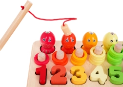Este colorido juego educativo de madera ofrece a los niños decenas de posibilidades: pescar con la caña magnética, ensartar y contar anillas en los pivotes, emparejar las cifras del 1 al 10, crear ecuaciones sencillas y reconocer formas y colores. Los vasitos de silicona y las cuentas de madera con la pinza, la cucharita y los palitos desarrollan estupendamente el agarre y la precisión.