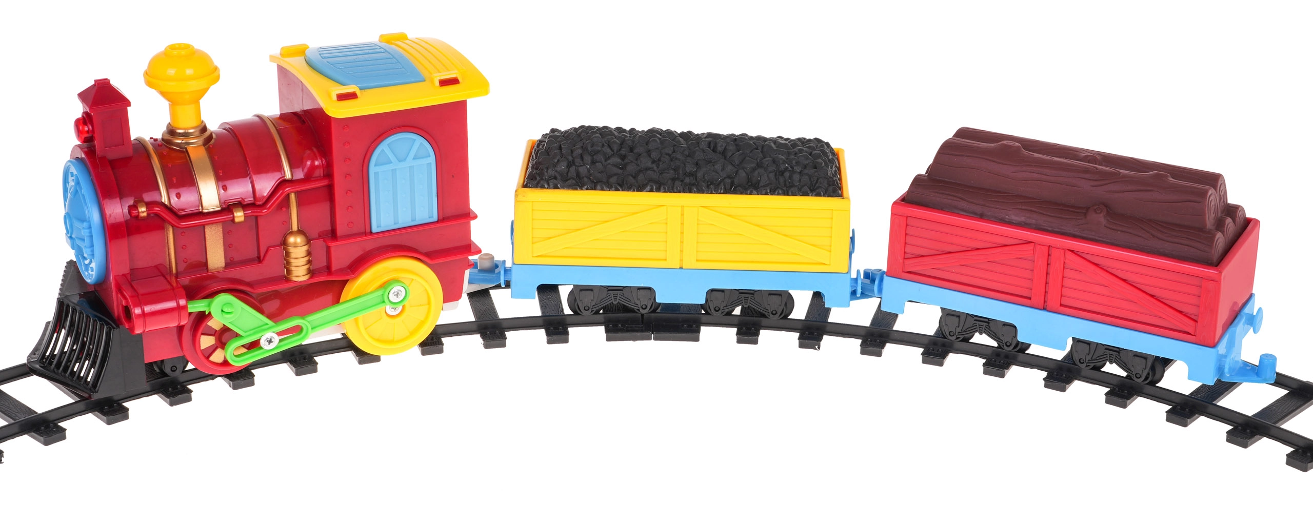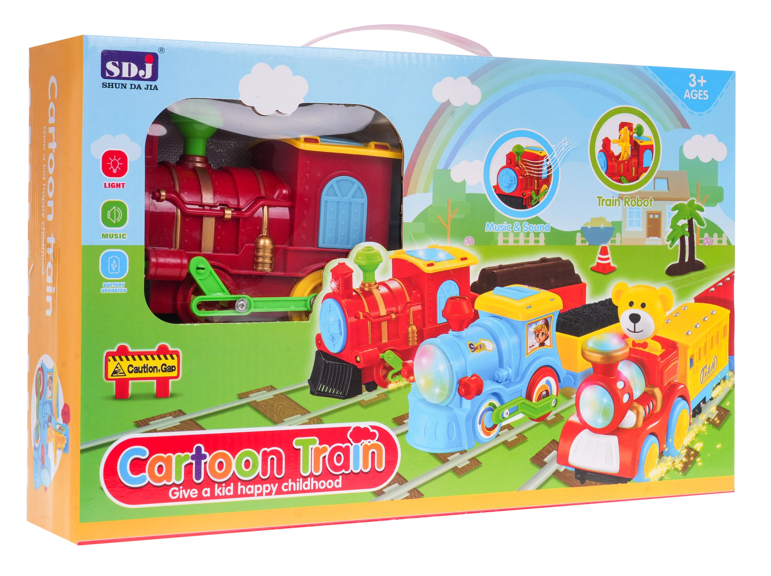 Este colorido tren de plástico hará las delicias de cualquier pequeño maquinista. La locomotora está equipada con luces intermitentes en la parte frontal, superior y lateral de la cabina, y durante la marcha emite sonidos realistas. Un elemento llamativo es la cabina abatible, de la que se desliza una figurita de robot durante el movimiento.