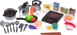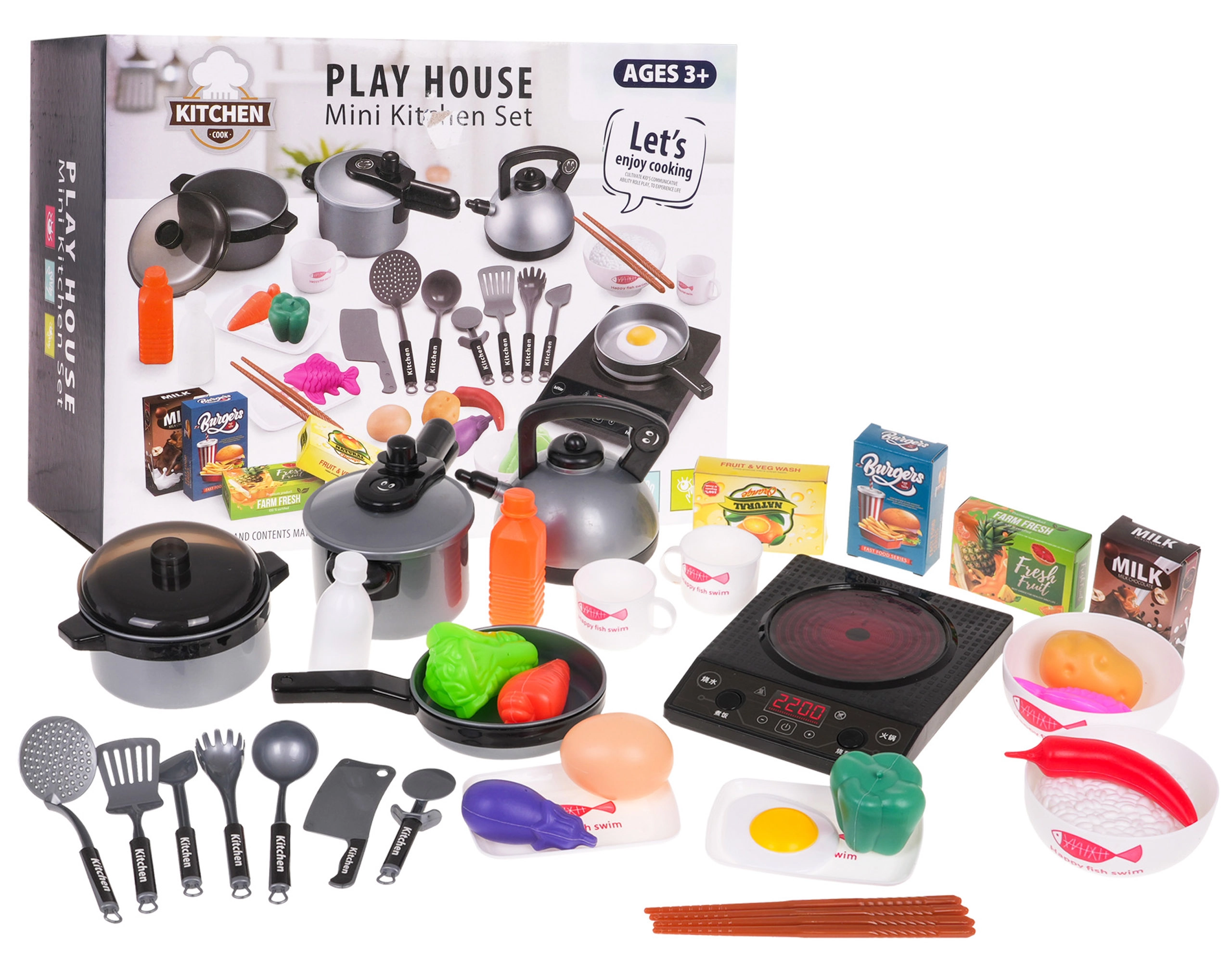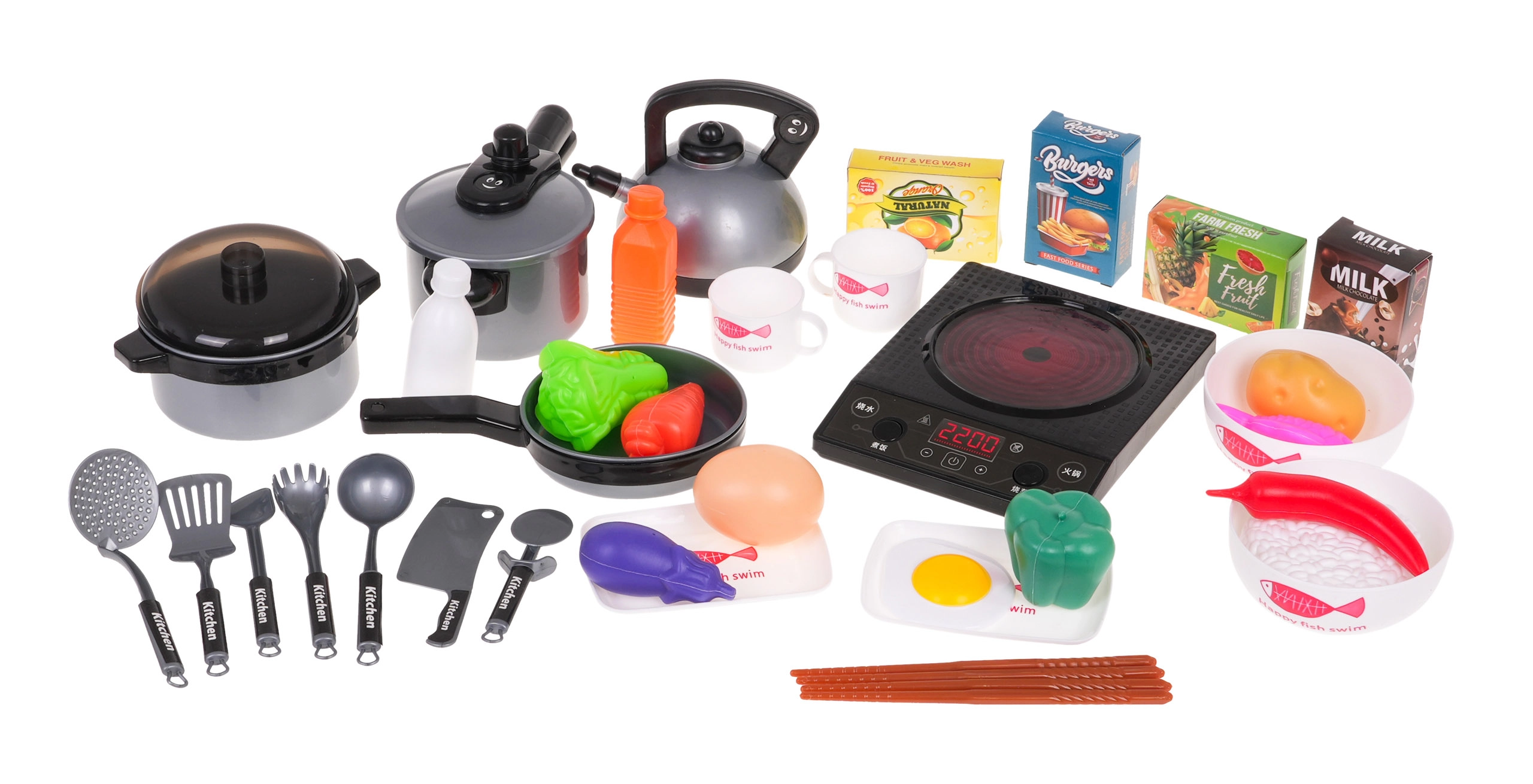 Este increíble juego de cocina incluye todo lo que un pequeño cocinero puede necesitar. La placa de inducción, que funciona con tres pilas AA, permite sonidos realistas de freír y cocinar; los elementos de plástico seguros como ollas, sartenes y otros accesorios son ideales para el juego infantil, sin bordes afilados ni riesgo de lesiones. El set incluye diversos alimentos de juguete, como huevos, pescado y verduras, que aportan autenticidad al juego.