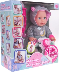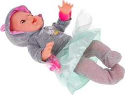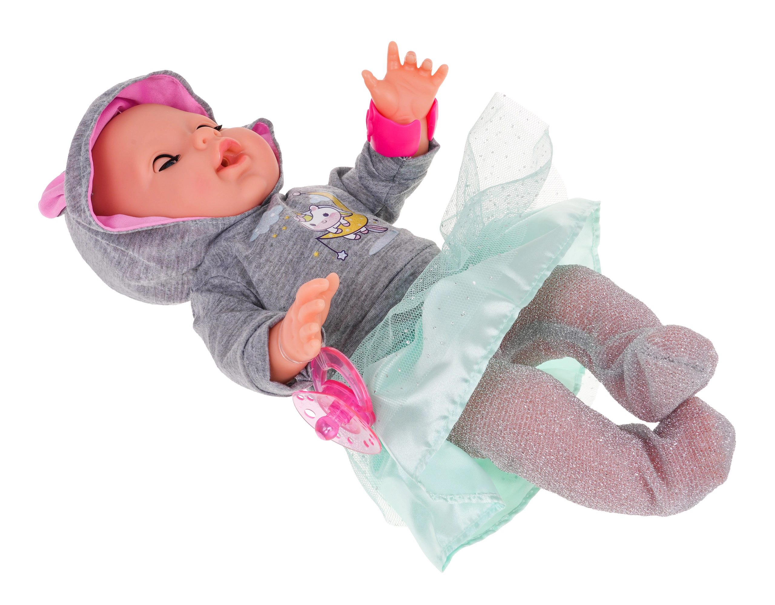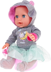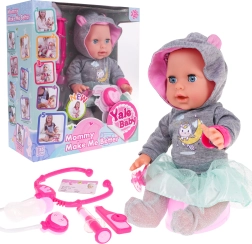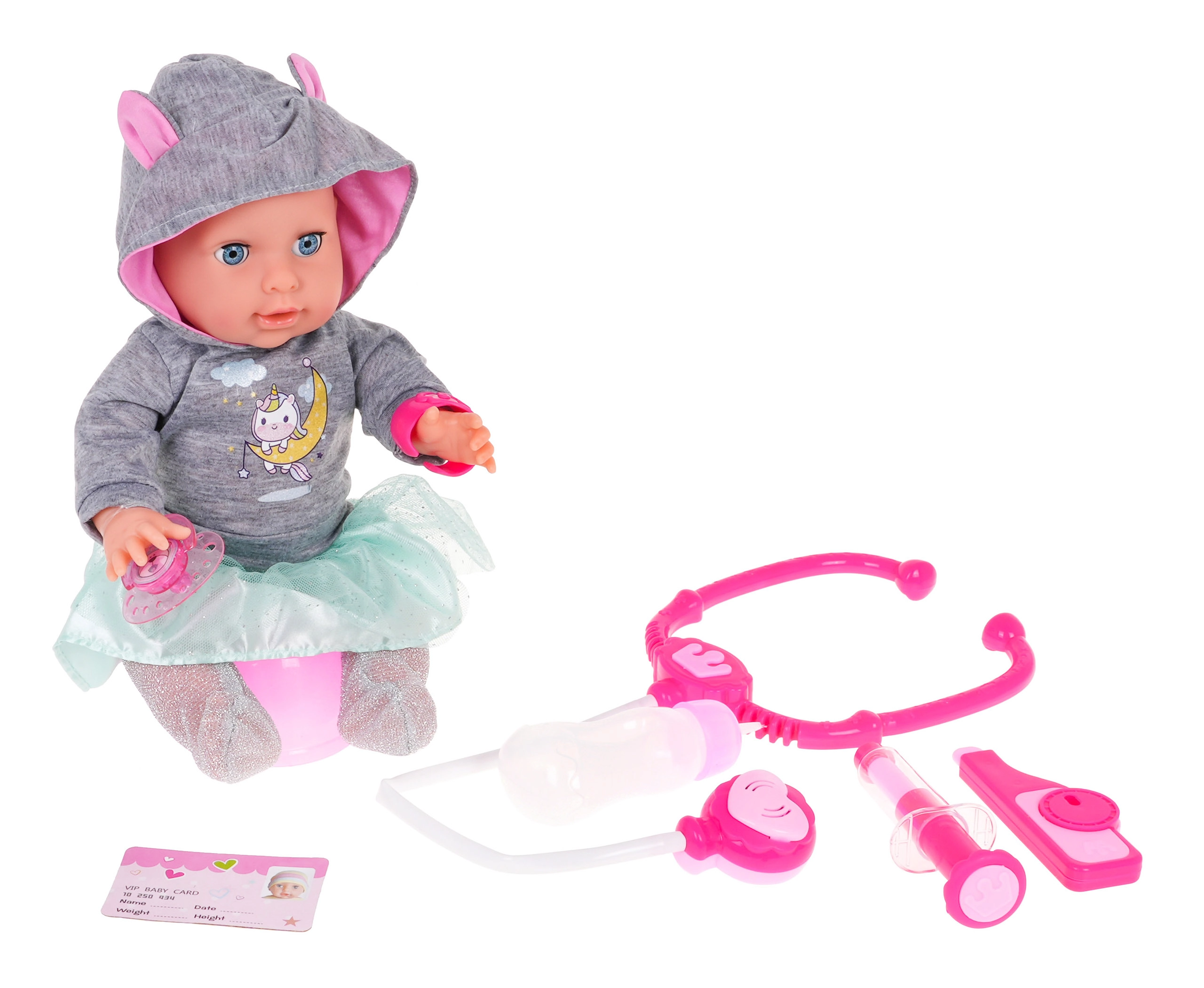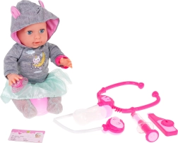 Adorable muñeca interactiva para niños a partir de 3 años que ofrece un cuidado del bebé realista y juego de médicos. Puede llorar, reír, estornudar y toser, cerrar y abrir los ojos, beber agua y hacer pis en el orinal. Cuando “se enferma”, se le iluminan las mejillas como con fiebre. El paquete incluye un completo set médico con chupete magnético, jeringa, termómetro, biberón de agua y estetoscopio con luz y sonidos.