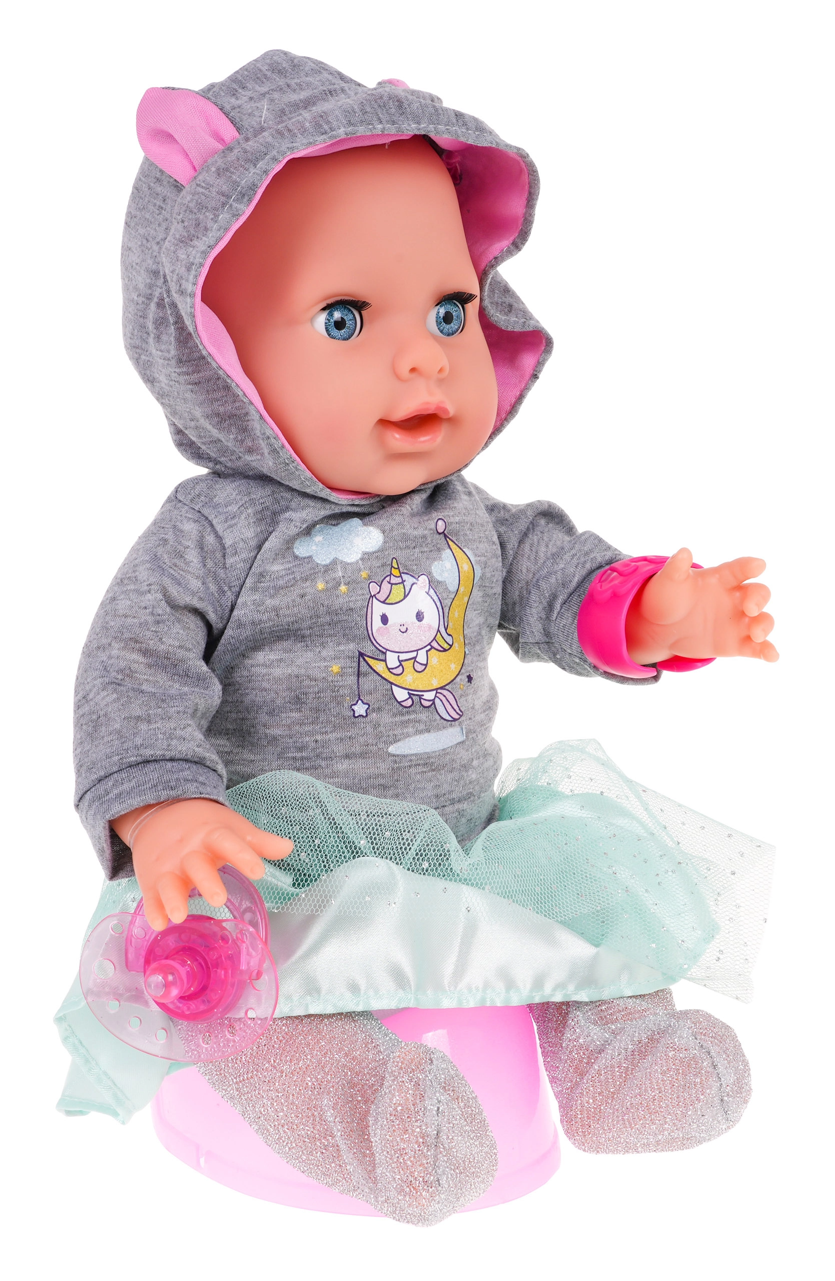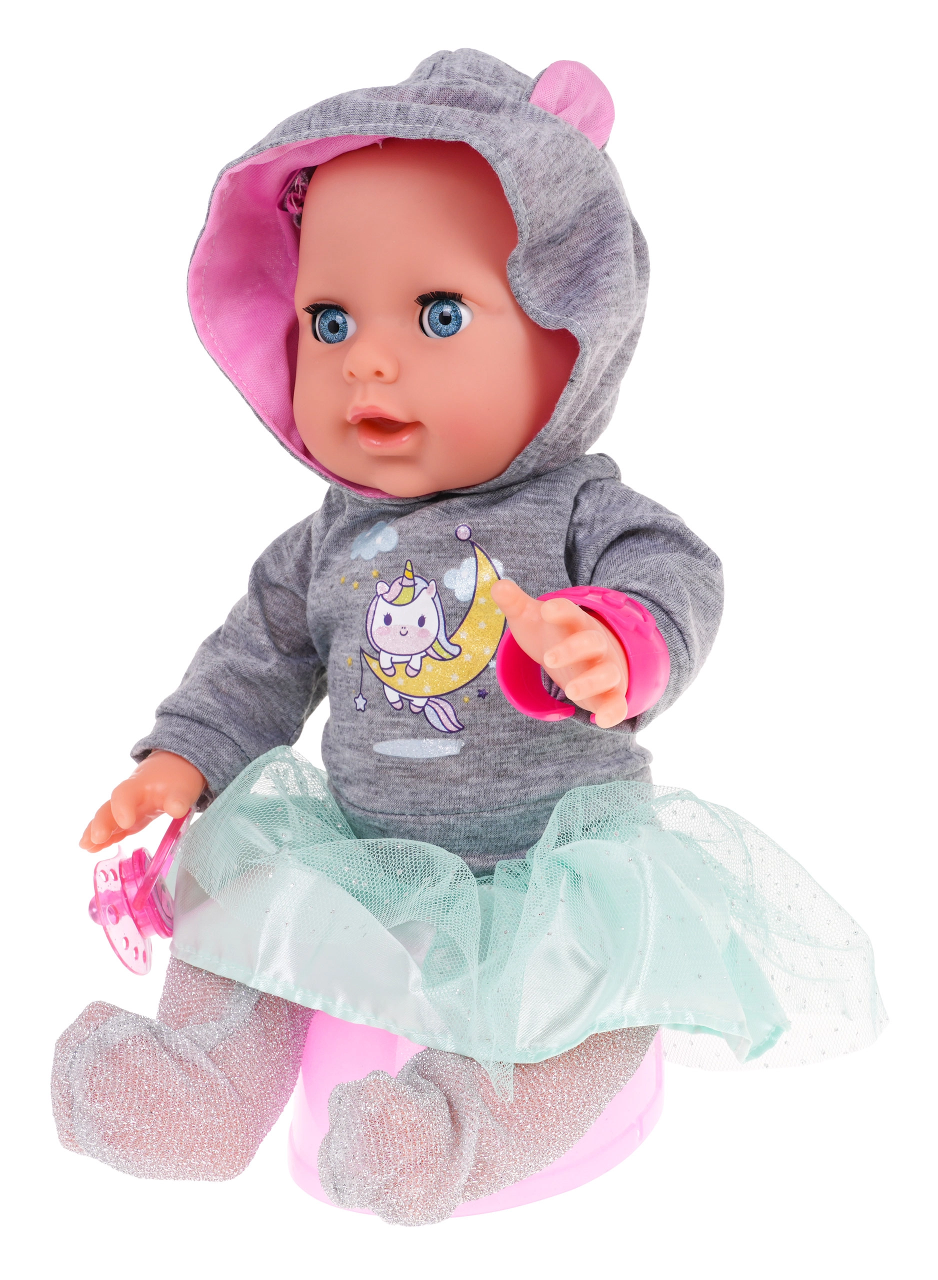 Después de beber del biberón, la muñeca puede hacer sus necesidades en el orinal. El chupete magnético la calma rápidamente cuando “está enferma” o está inquieta.